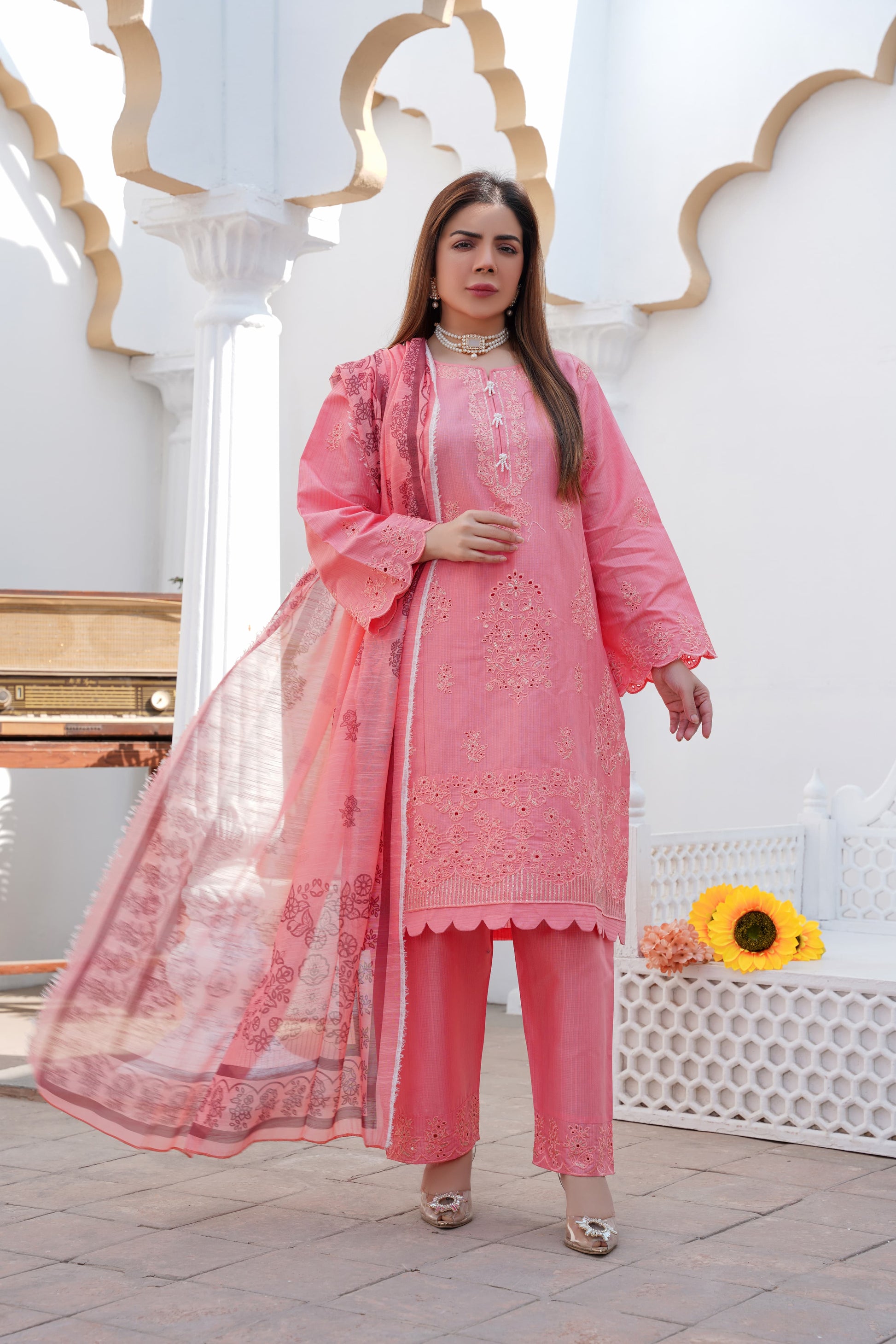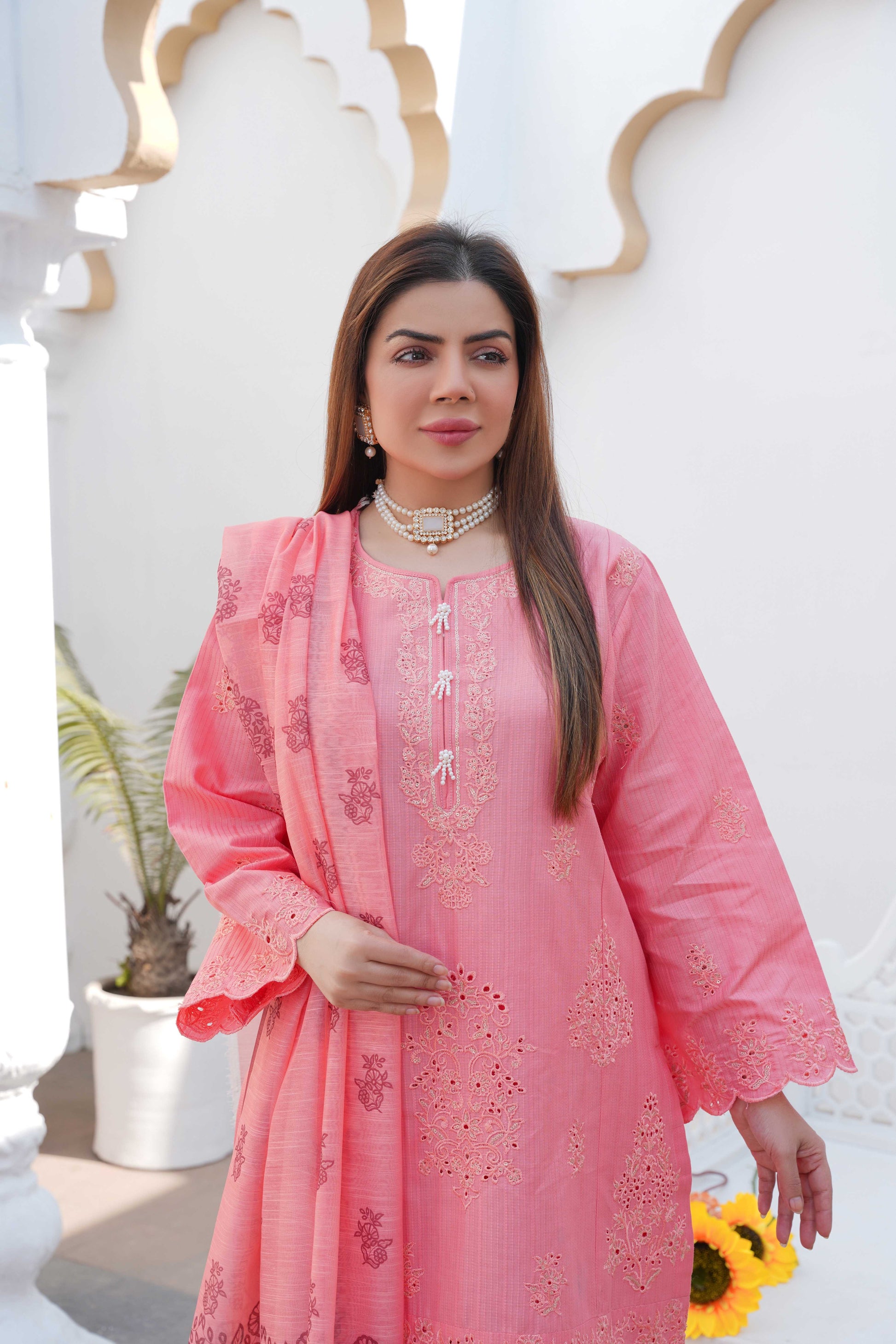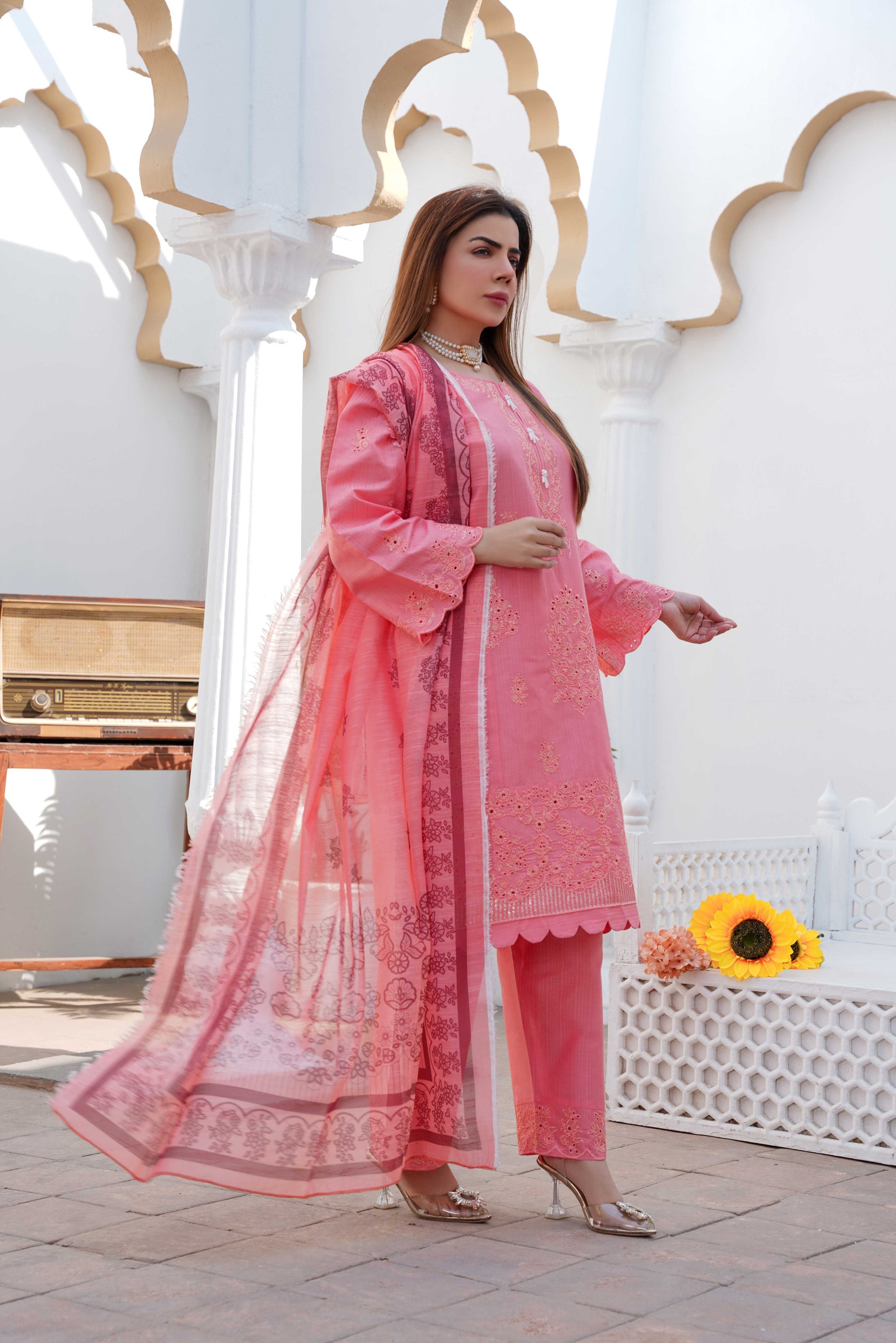 Description: A sophisticated 3-piece suit featuring delicate threadwork embroidery, paired with a flowing shiffon dupatta for a touch of grace and elegance. Ideal for formal events or festive celebrations.