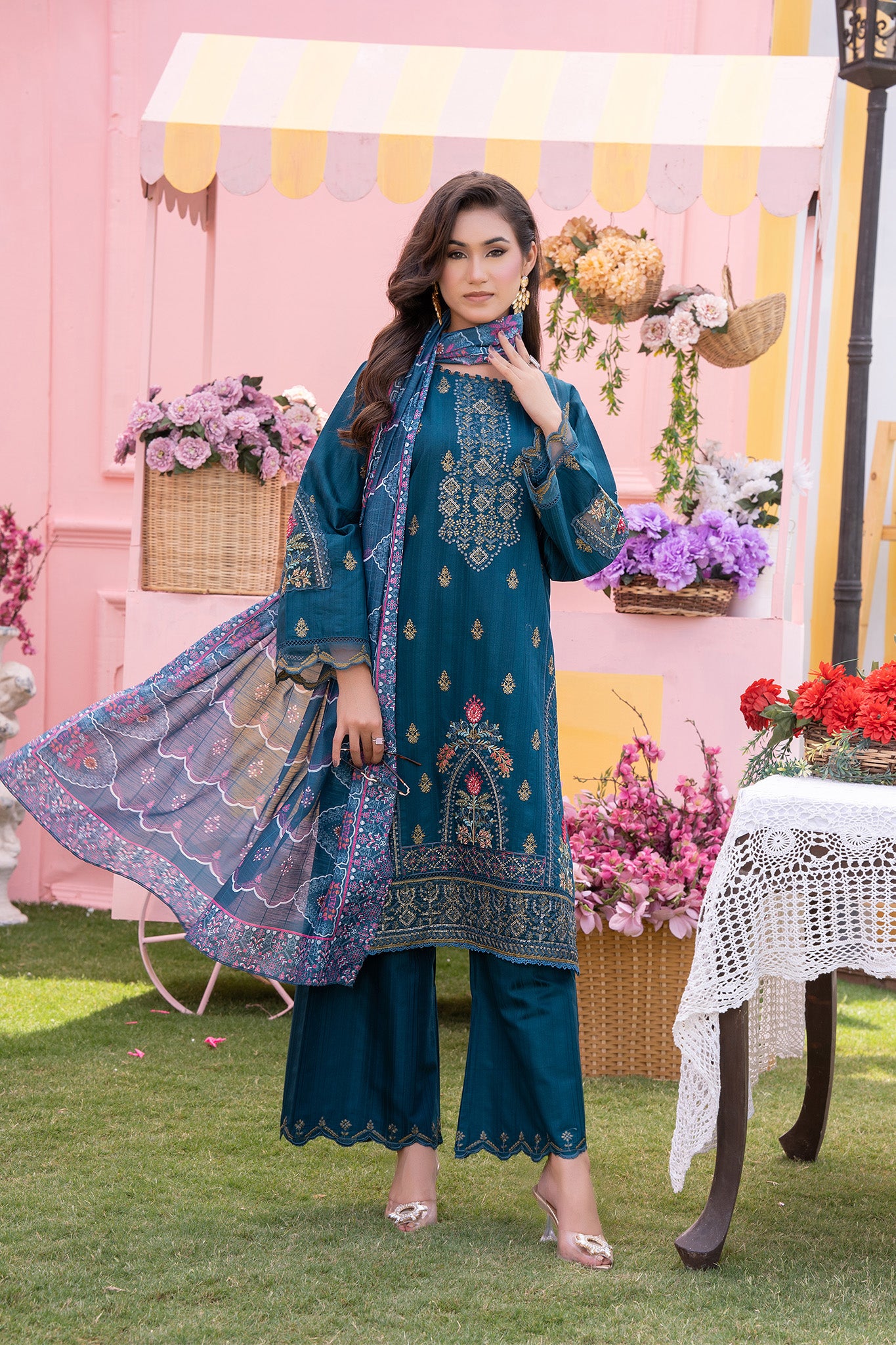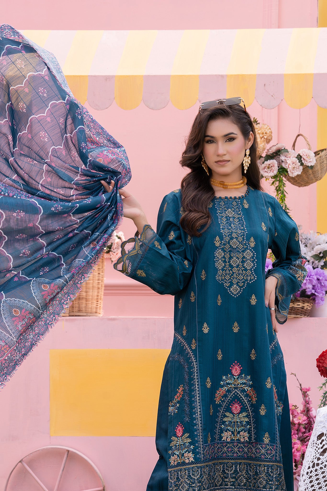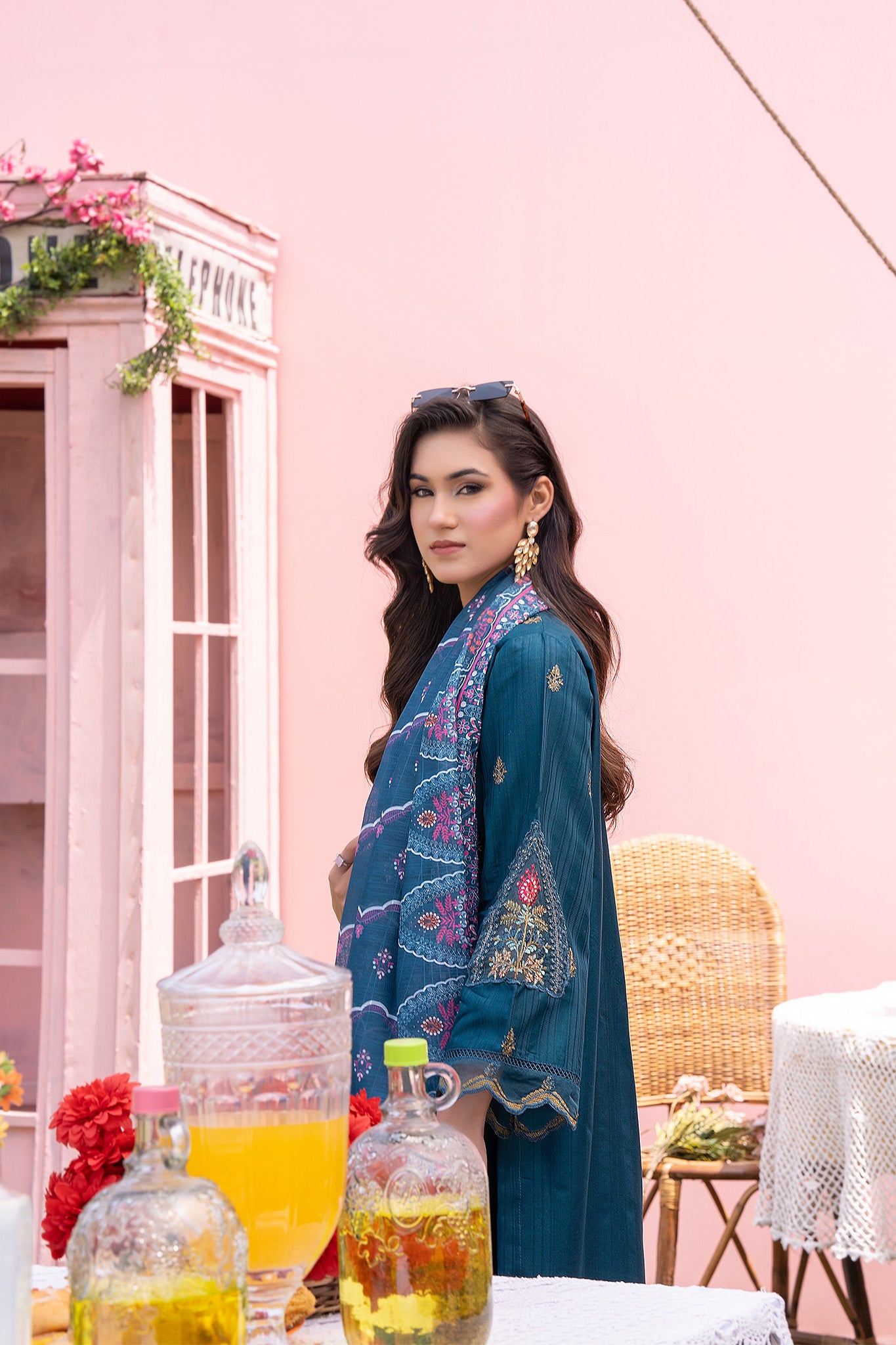 An elegant 3-piece stitched suit crafted from premium lawn, adorned with intricate threadwork embroidery. Paired with a lightweight printed dupatta to enhance its timeless charm. Perfect for festive gatherings or formal occasions.