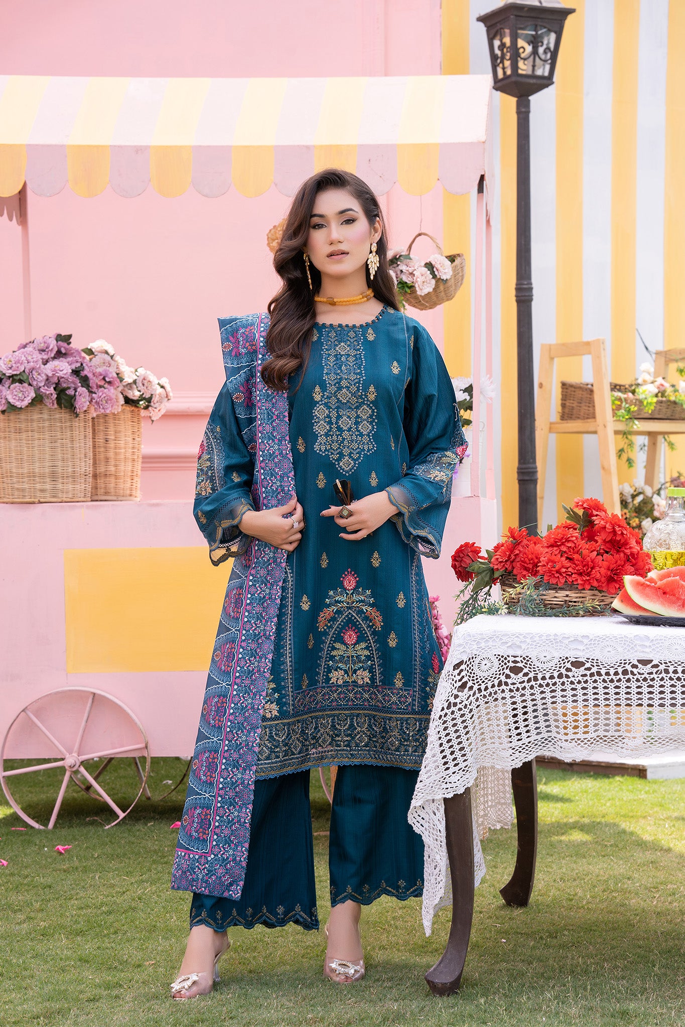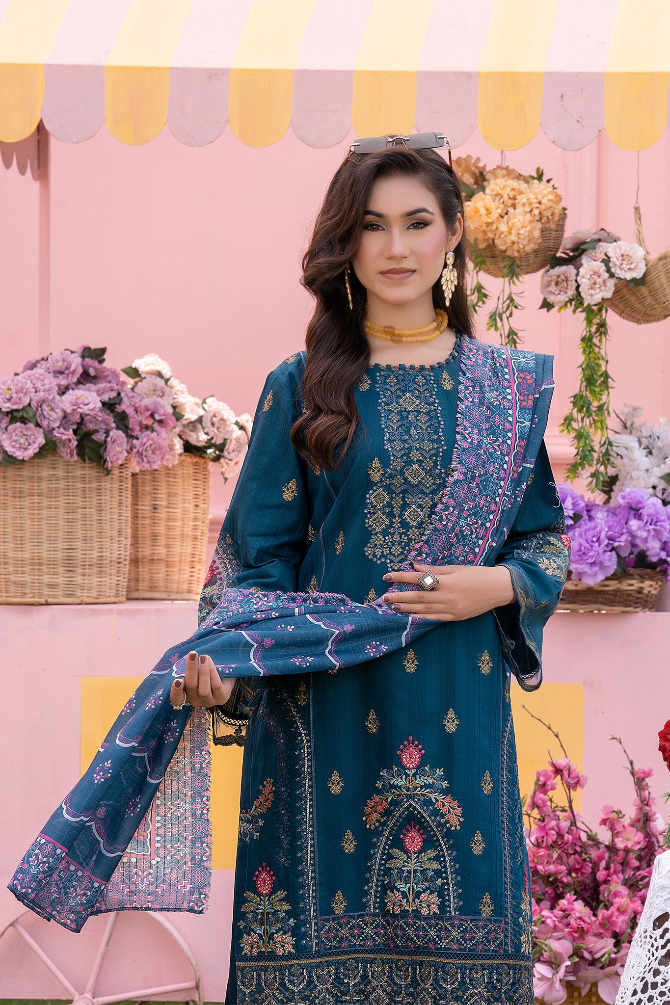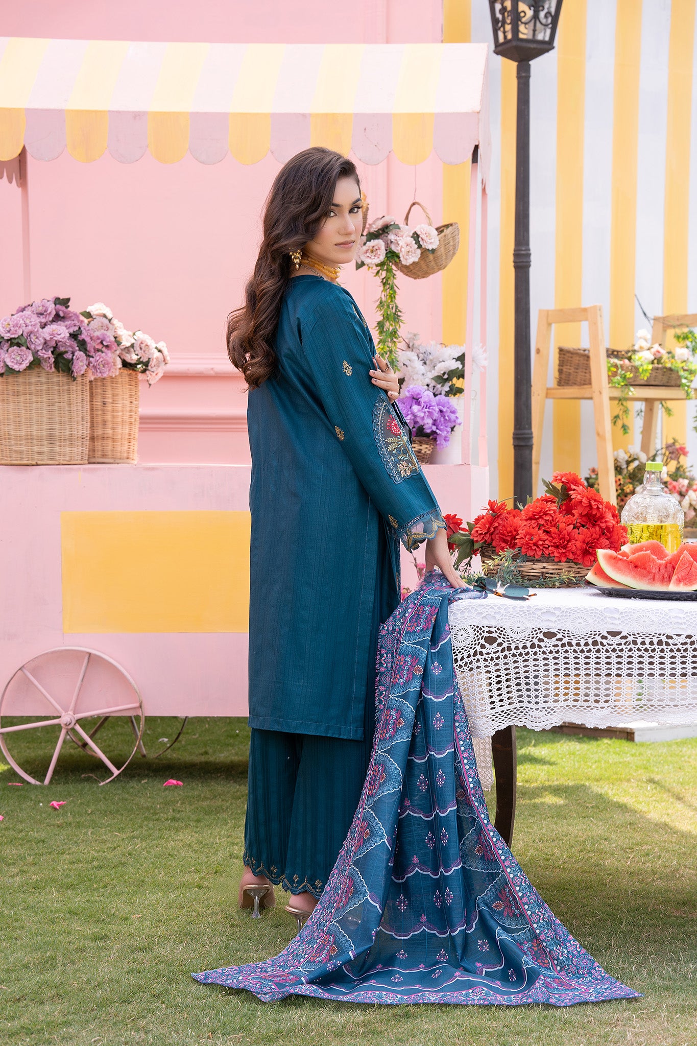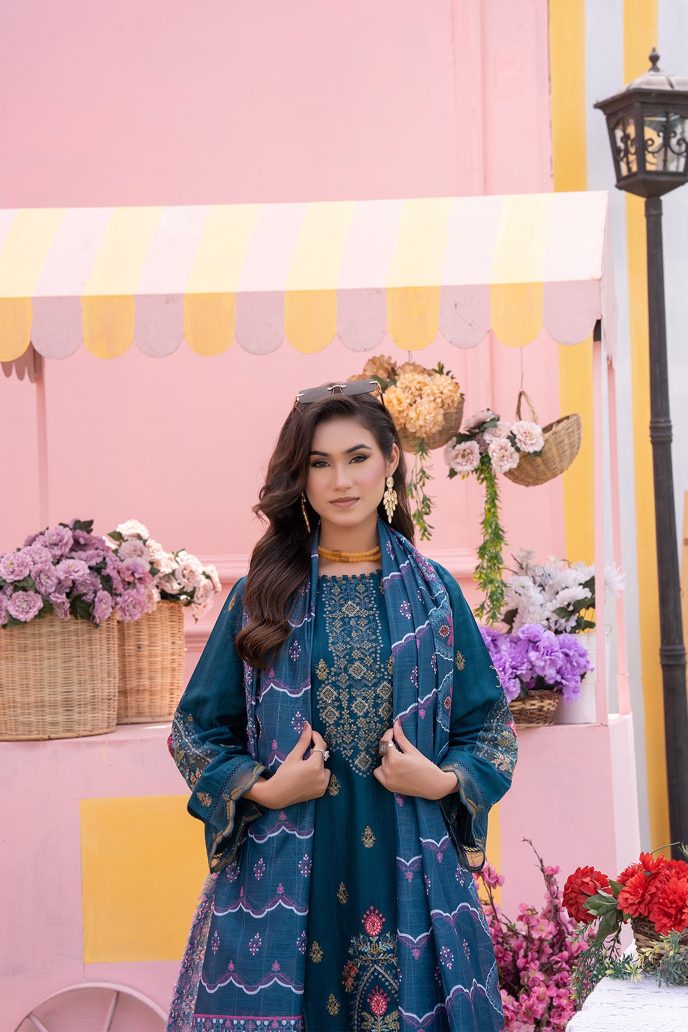An elegant 3-piece stitched suit crafted from premium lawn, adorned with intricate threadwork embroidery. Paired with a lightweight printed dupatta to enhance its timeless charm. Perfect for festive gatherings or formal occasions.
