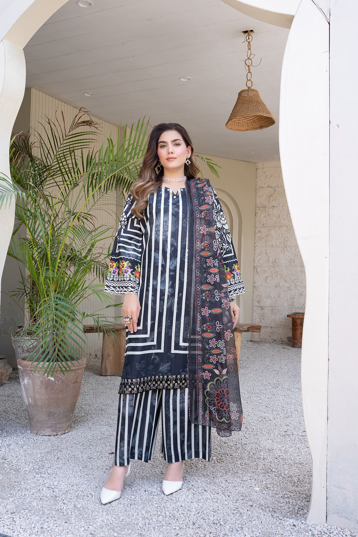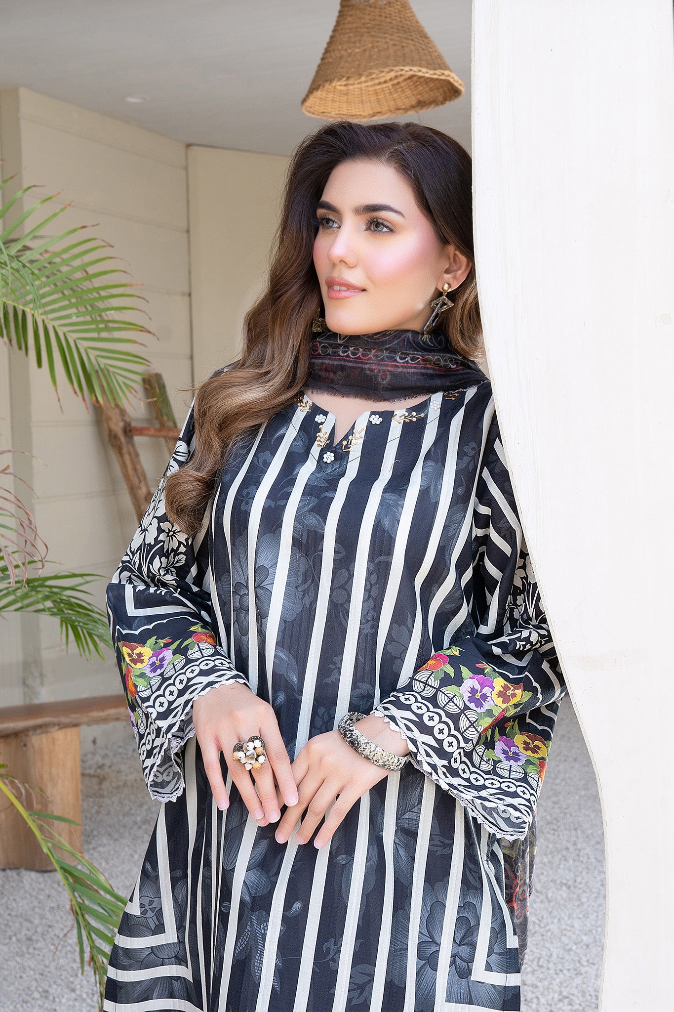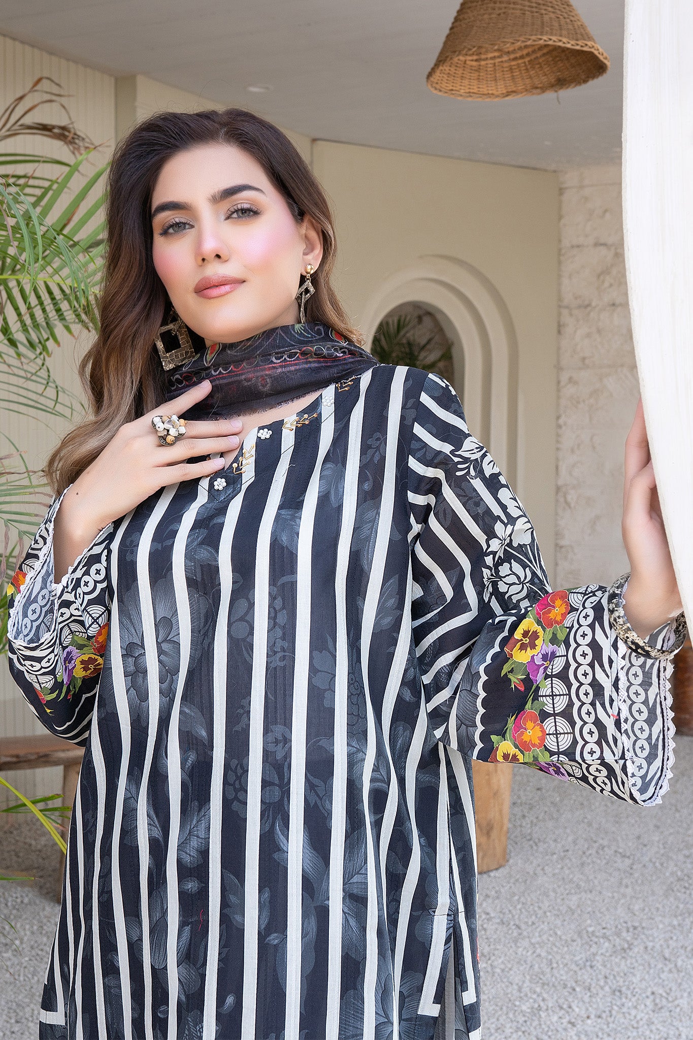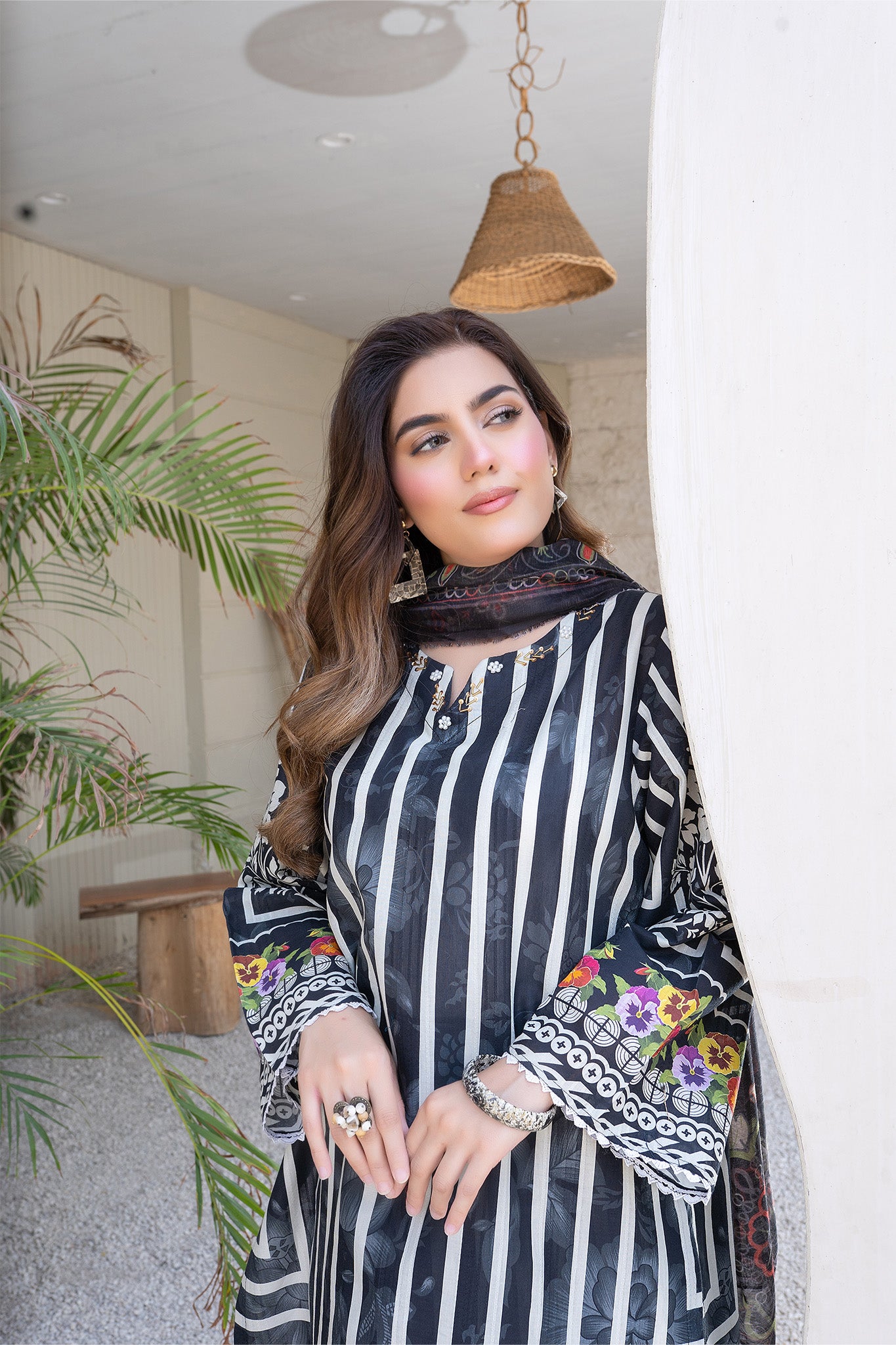 An elegant 3-piece stitched suit crafted from premium lawn, adorned with printed elegance. Paired with a lightweight printed chiffon dupatta to enhance its timeless charm. Perfect for festive gatherings or formal occasions.