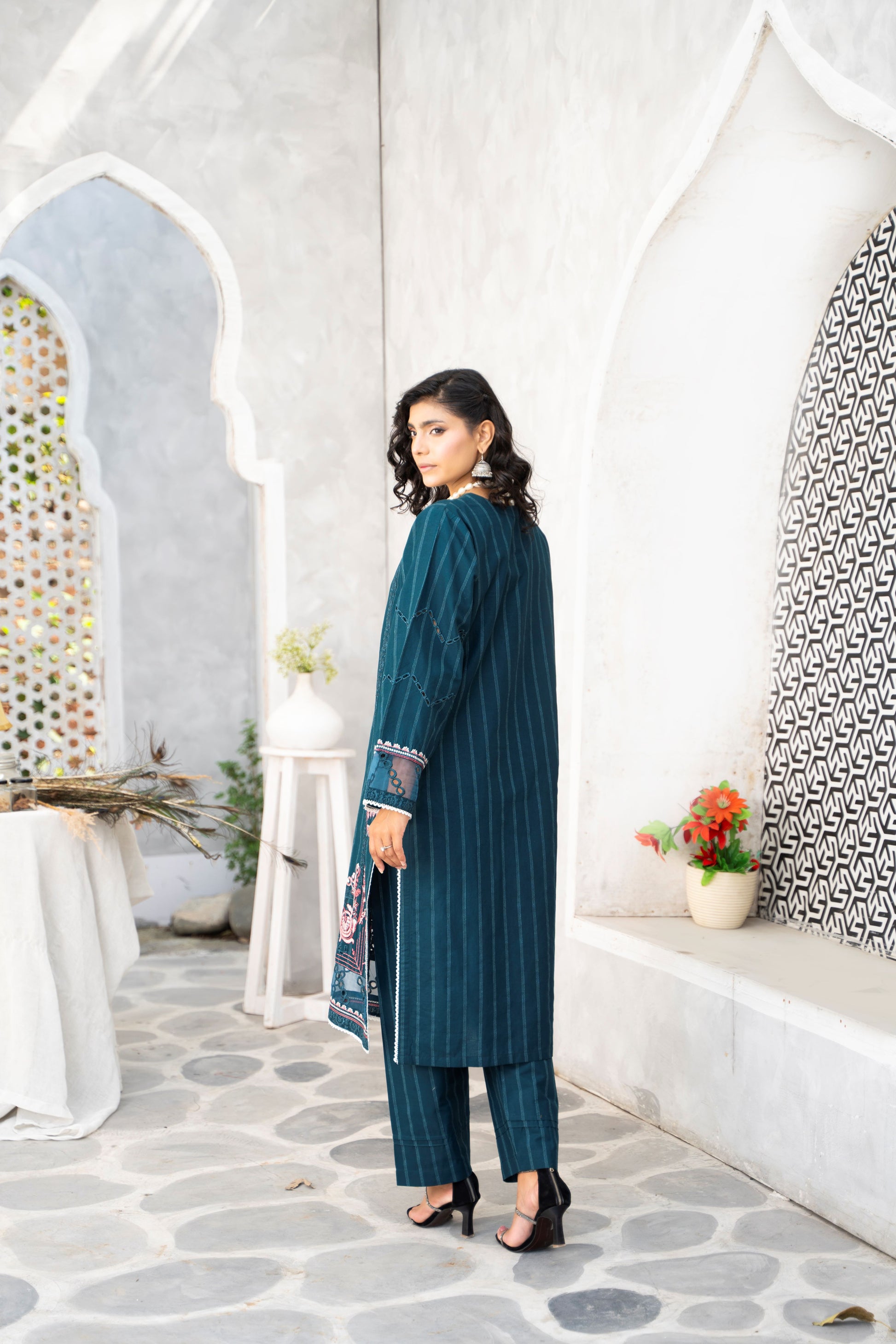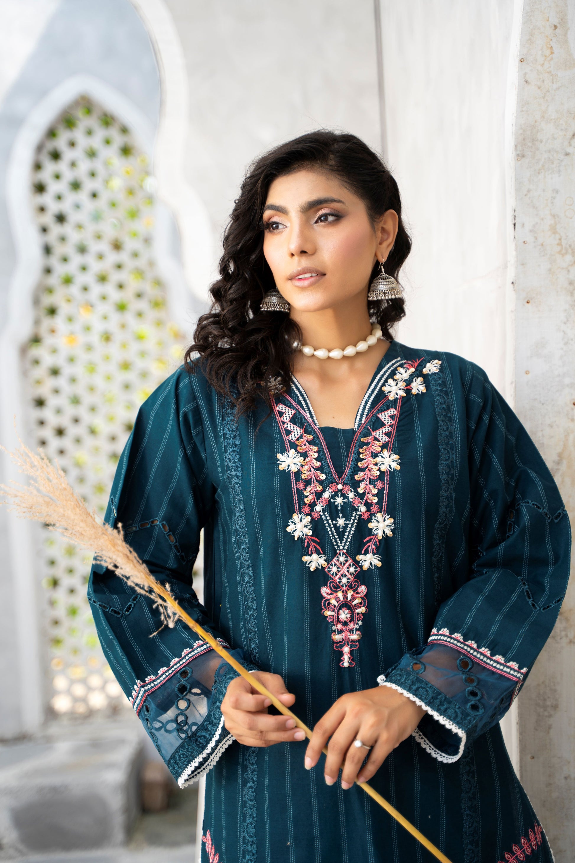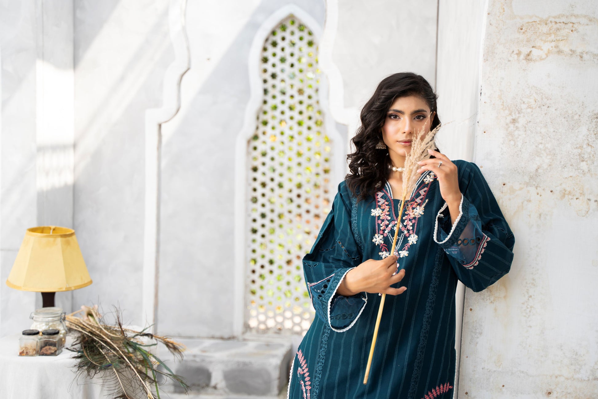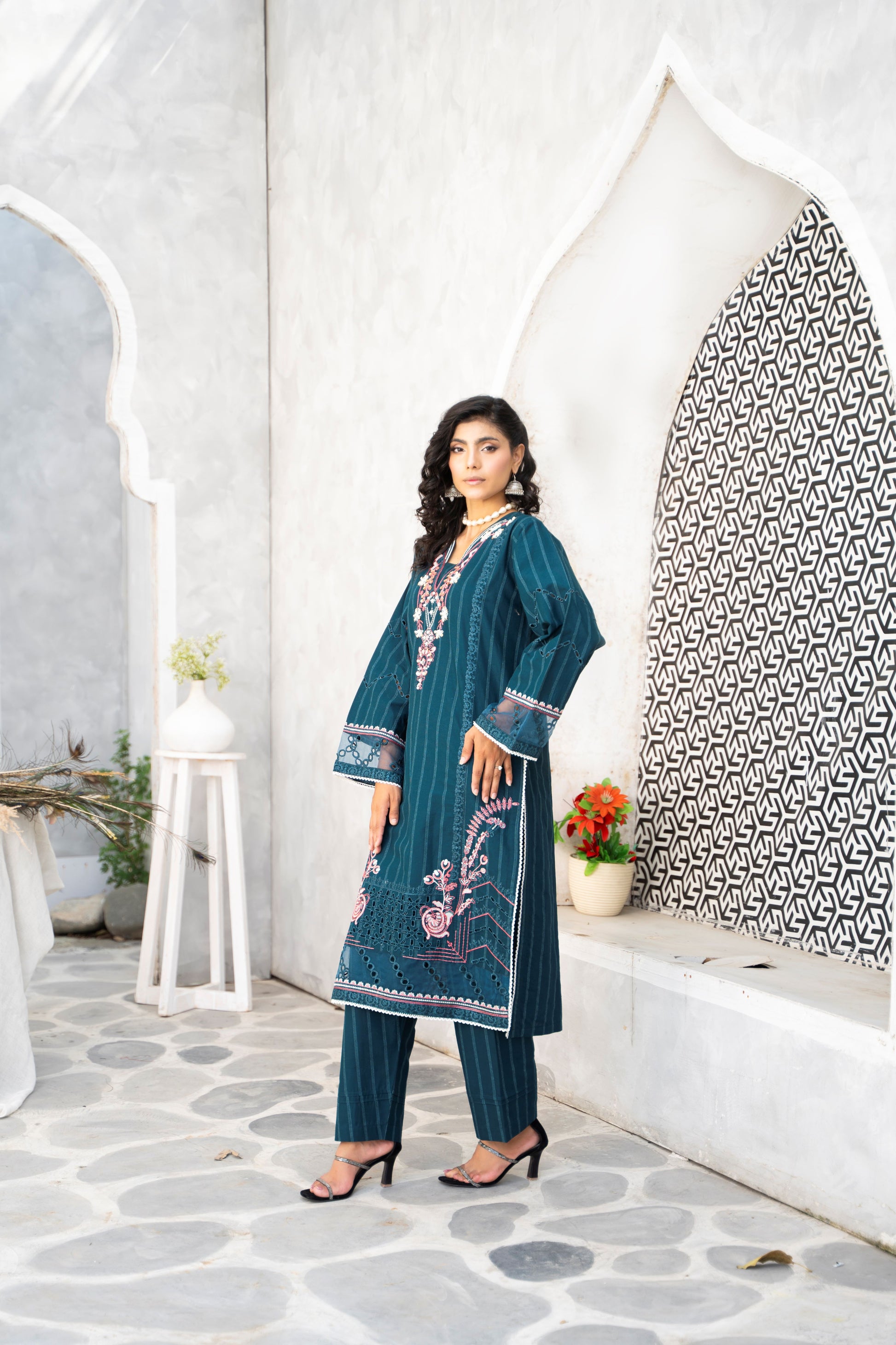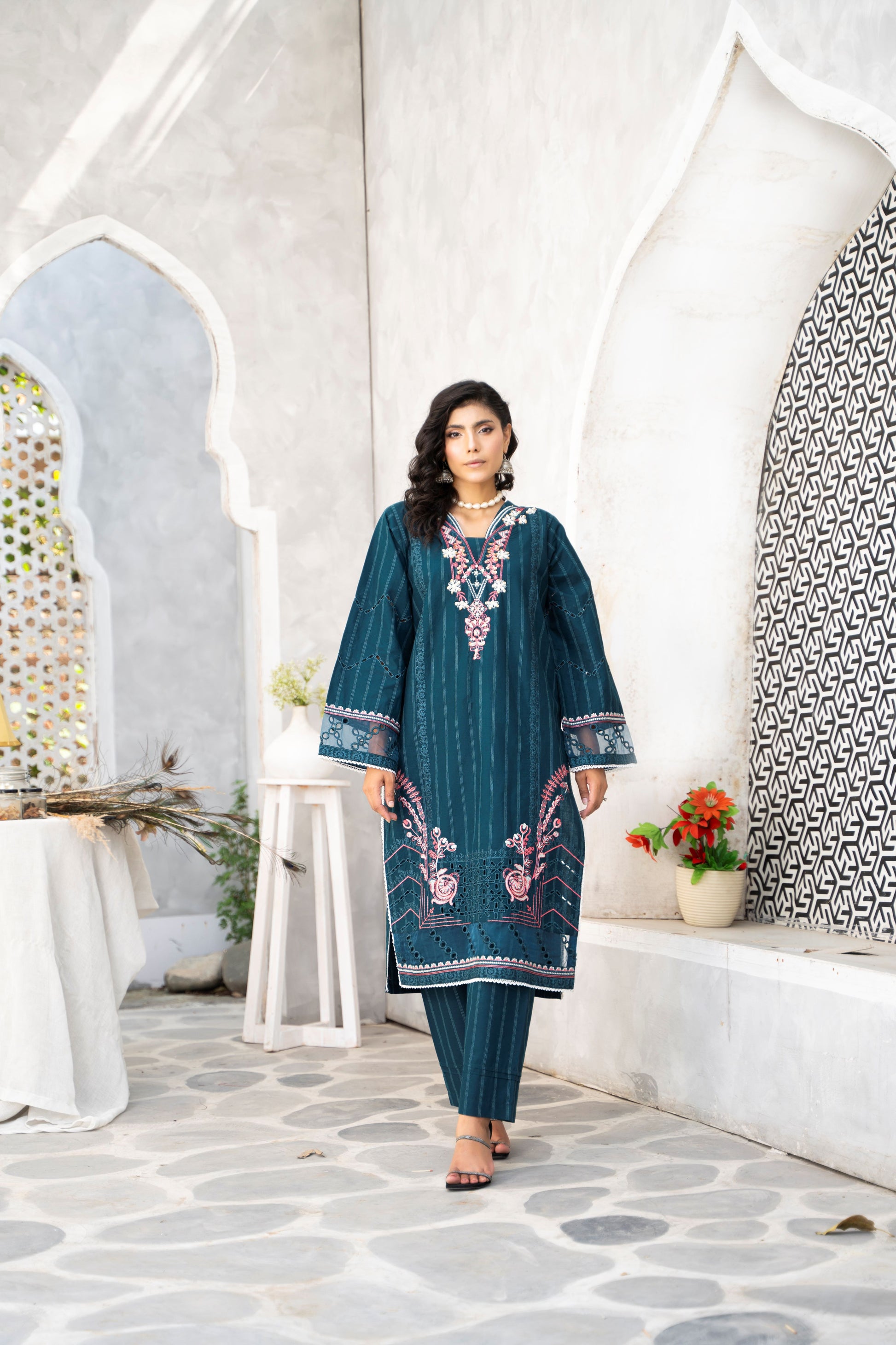 Step into effortless grace with Pakeeza, a masterpiece in mint green cambric. This 2-piece suit features a flowing long-length shirt that radiates charm and sophistication, making it your go-to ensemble for a refreshing yet elegant look.