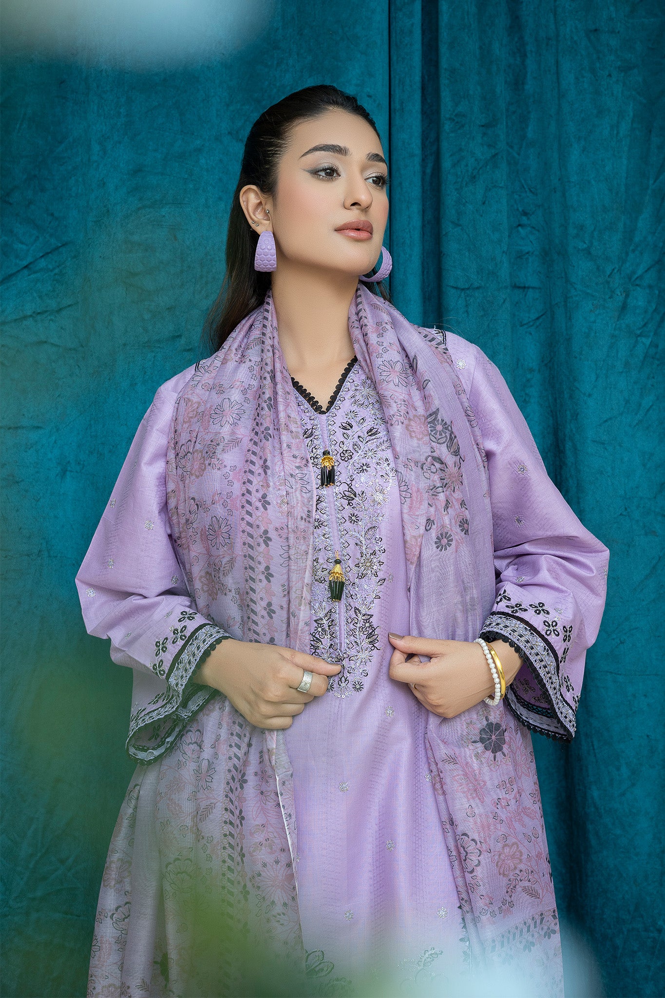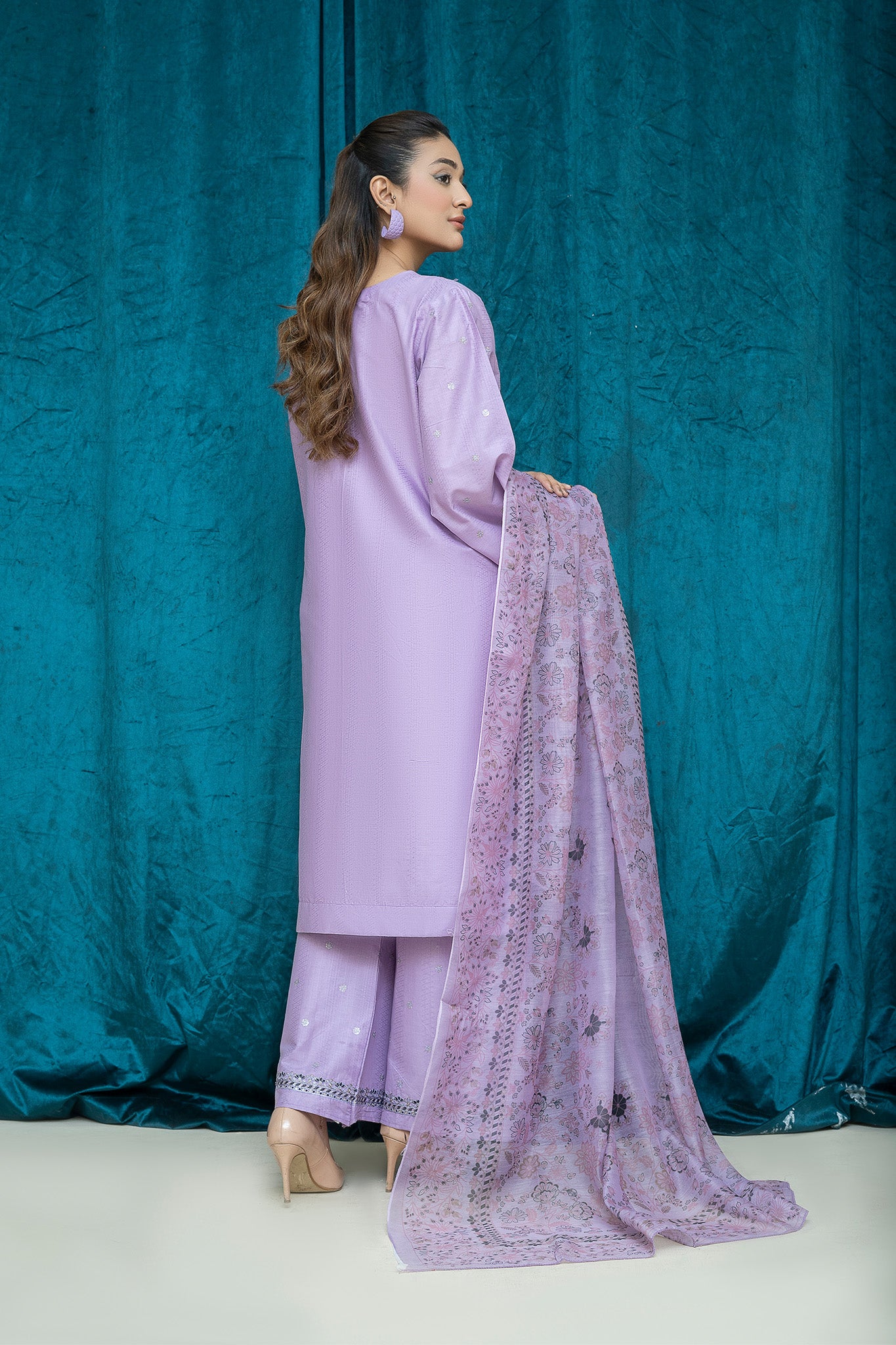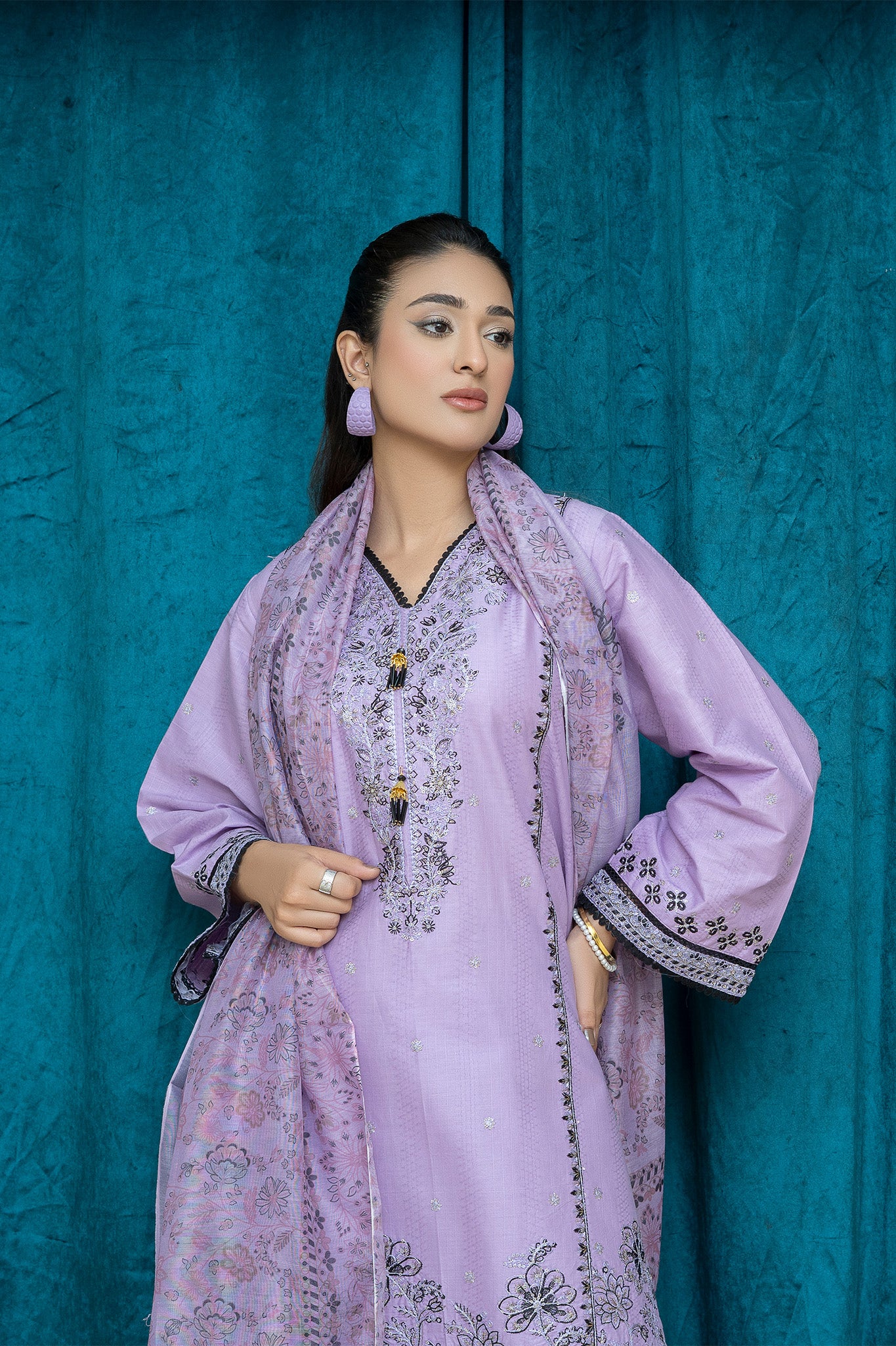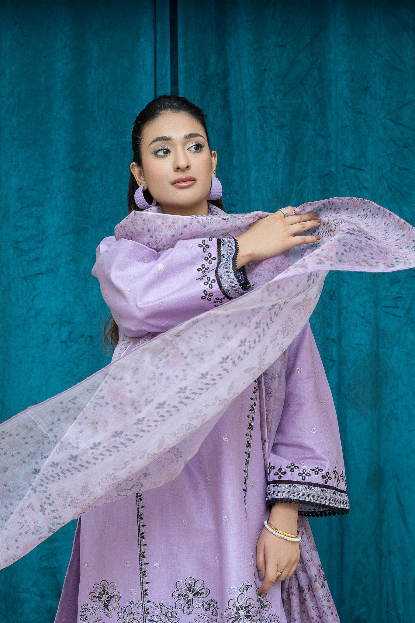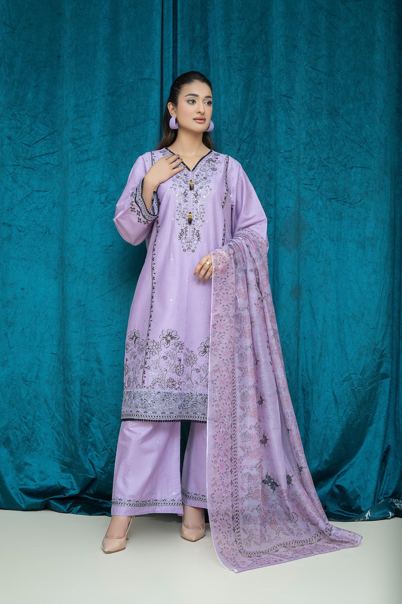 An elegant 3-piece stitched suit crafted from premium lawn, adorned with intricate threadwork embroidery. Paired with a lightweight printed chiffon dupatta to enhance its timeless charm. Perfect for festive gatherings or formal occasions.