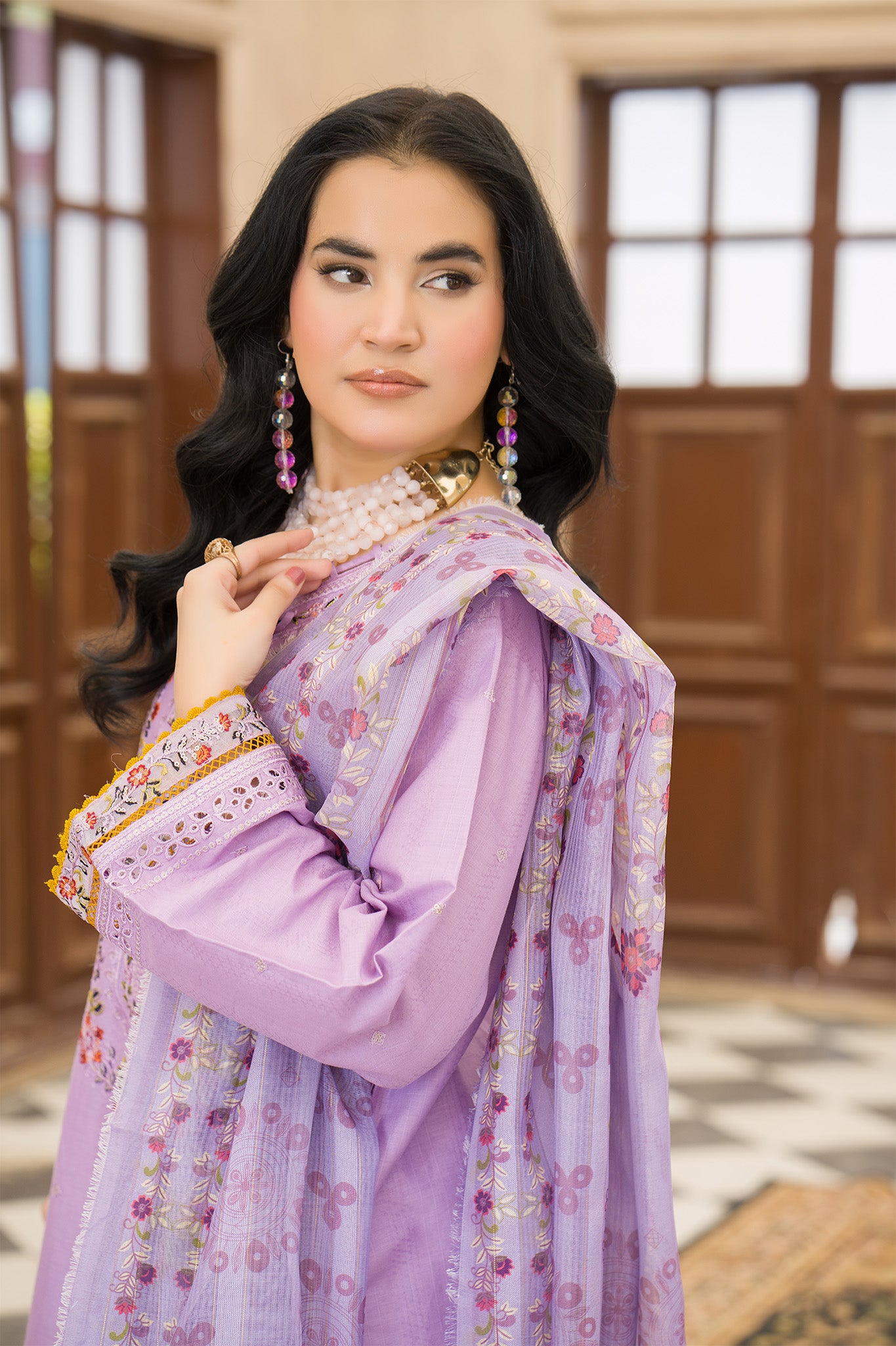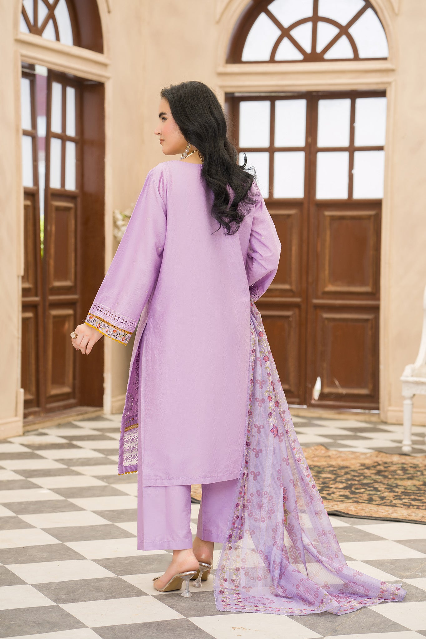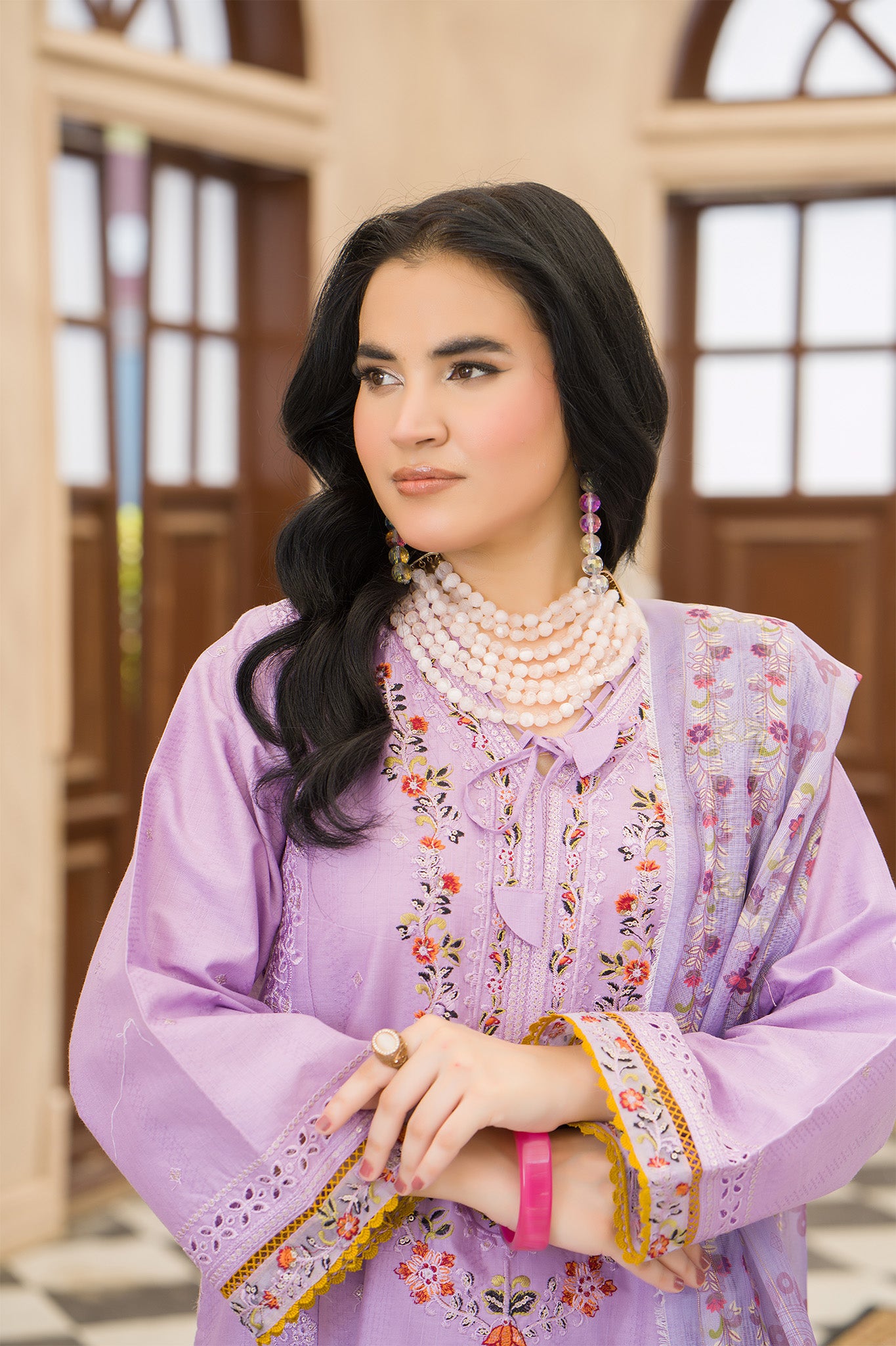 An elegant 3-piece stitched suit crafted from premium lawn, adorned with intricate threadwork embroidery. Paired with a lightweight printed chiffon dupatta to enhance its timeless charm. Perfect for festive gatherings or formal occasions.