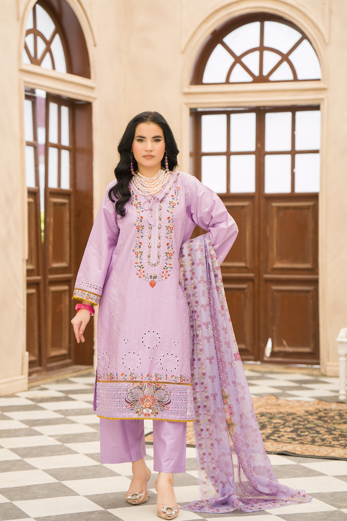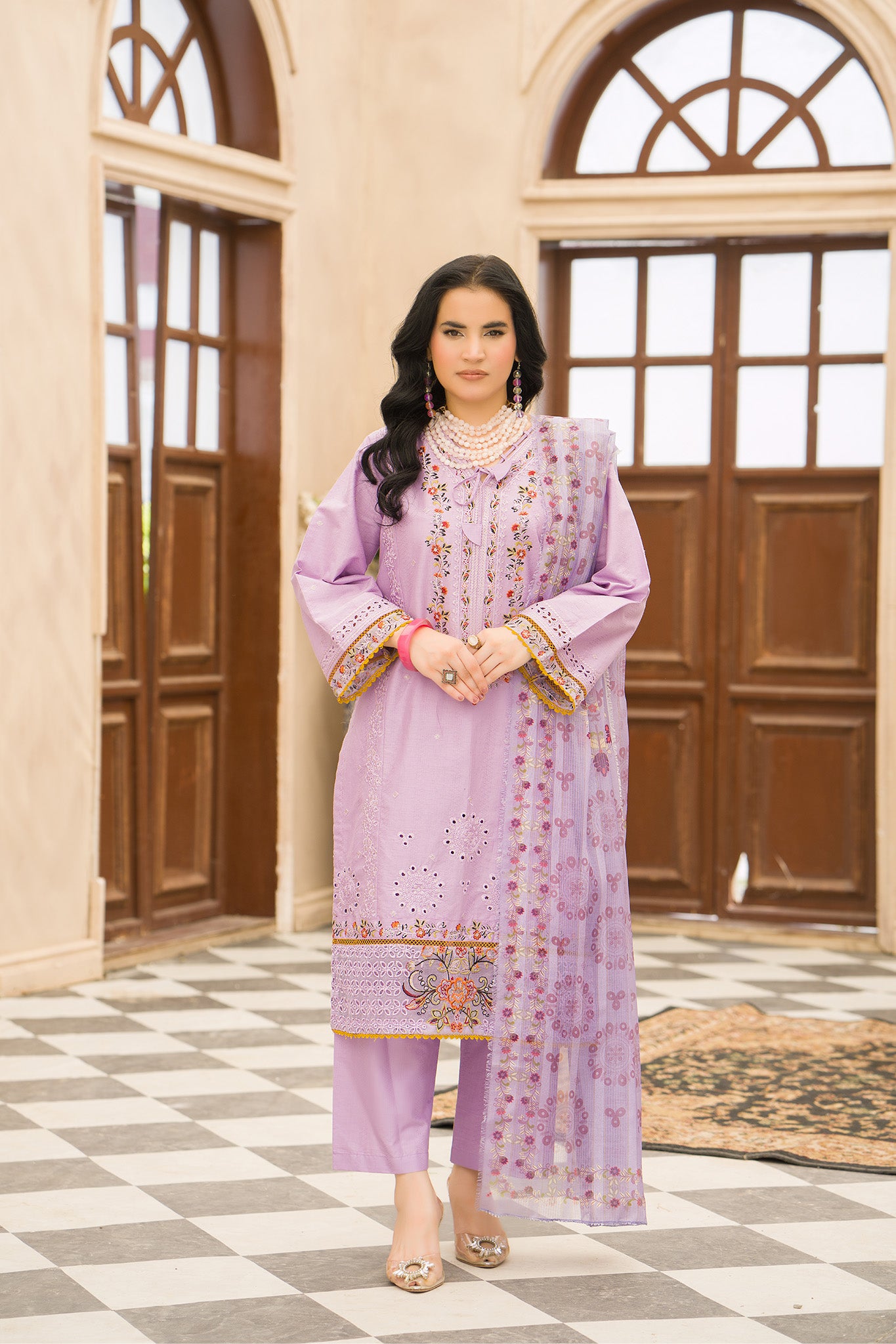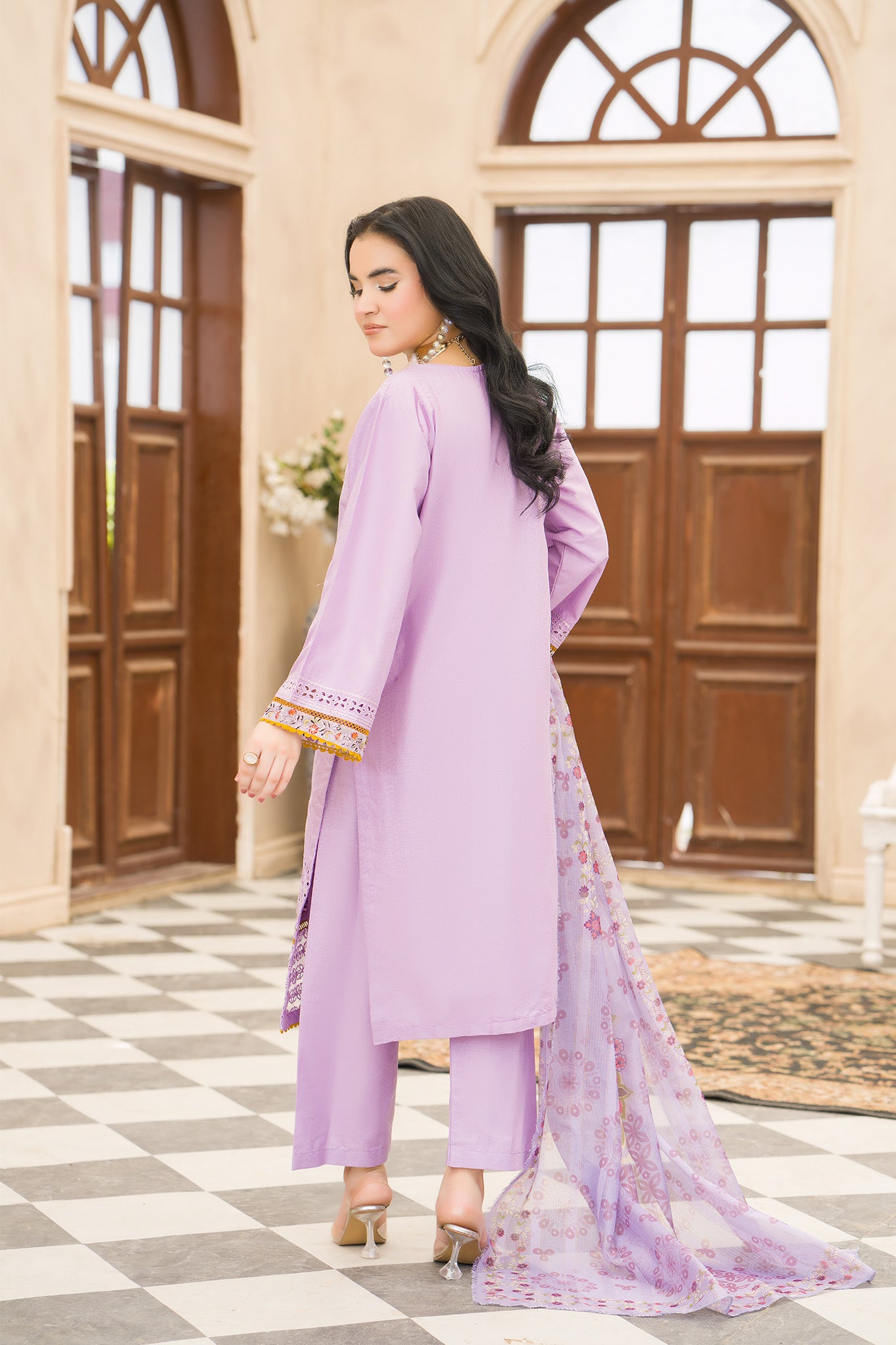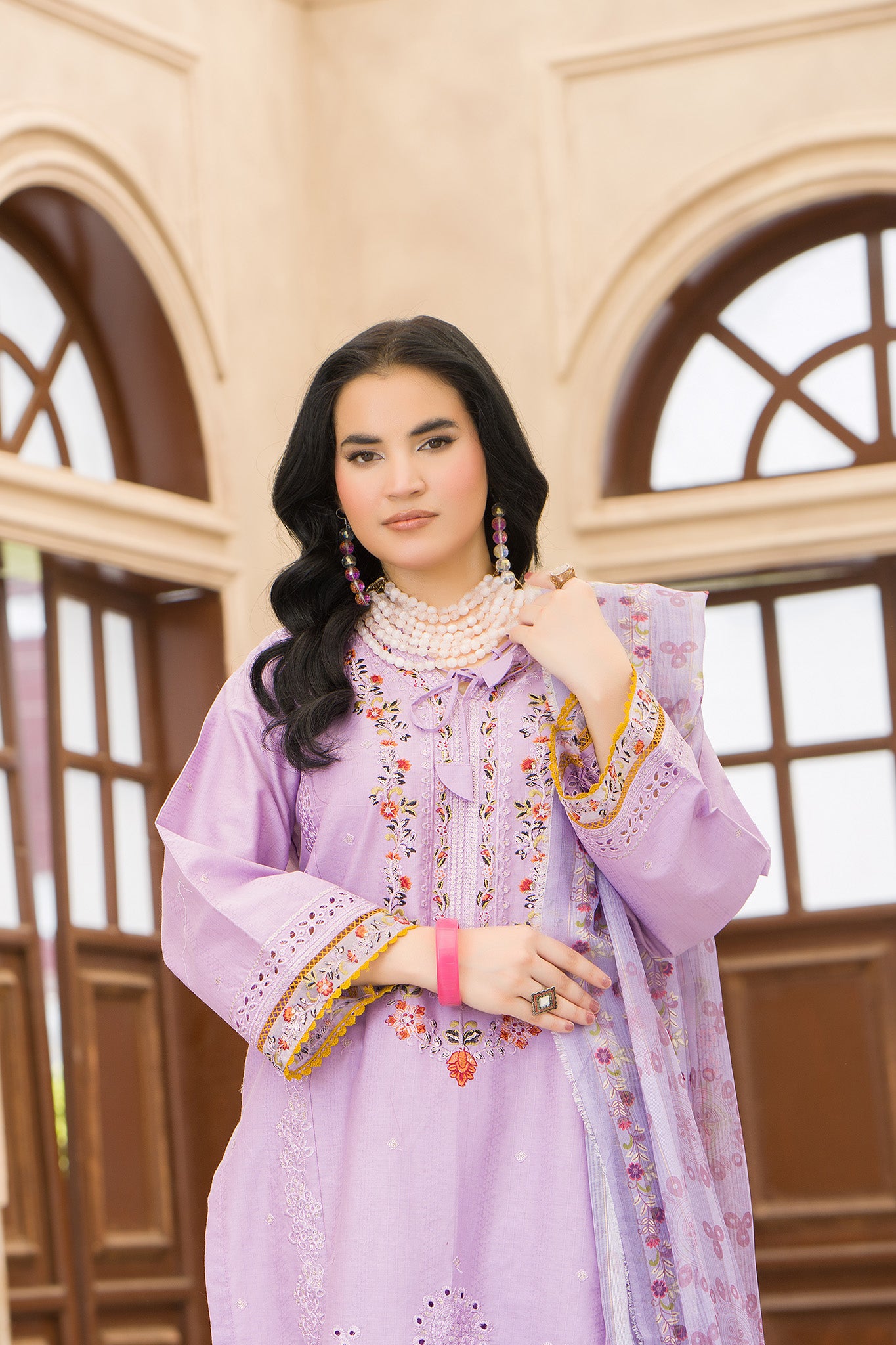 An elegant 3-piece stitched suit crafted from premium lawn, adorned with intricate threadwork embroidery. Paired with a lightweight printed chiffon dupatta to enhance its timeless charm. Perfect for festive gatherings or formal occasions.