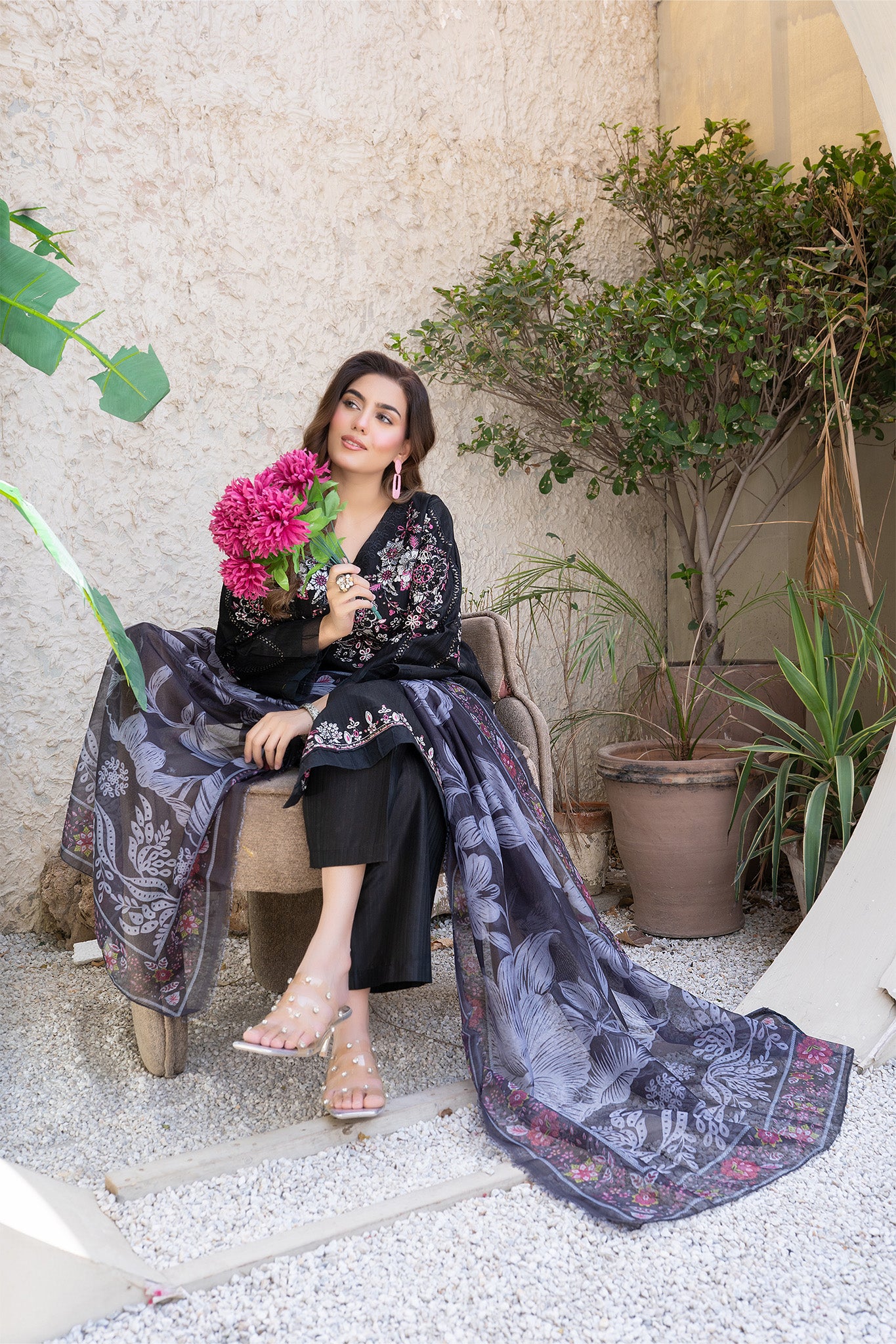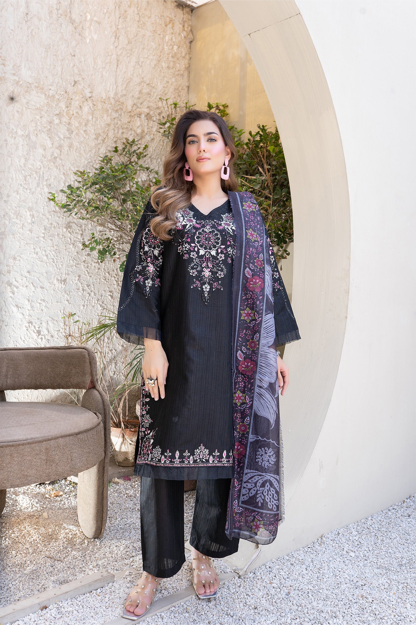 Description: A sophisticated 3-piece suit featuring delicate threadwork embroidery, paired with a flowing shiffon dupatta for a touch of grace and elegance. Ideal for formal events or festive celebrations.