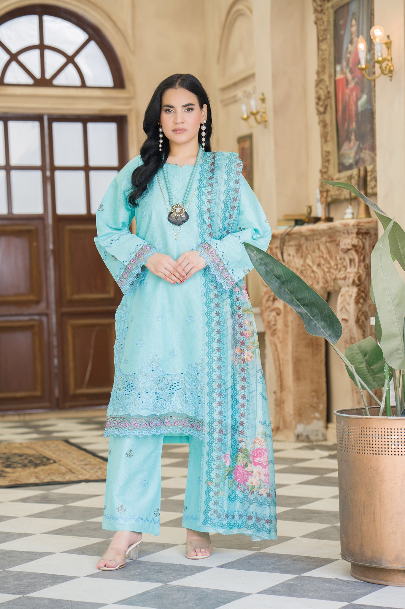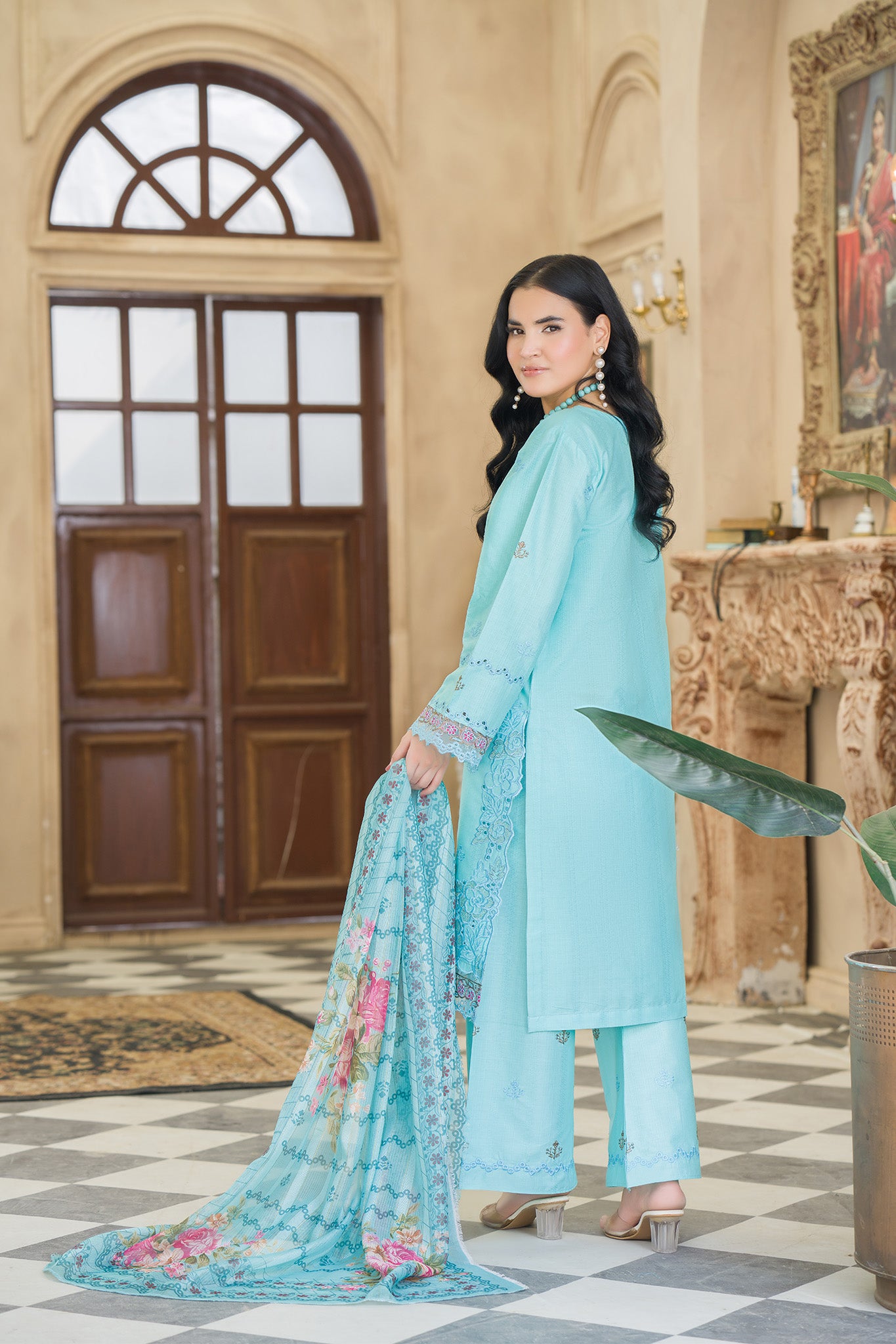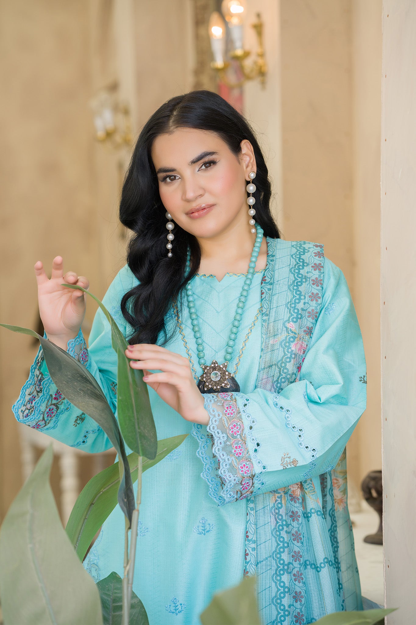 An elegant 3-piece stitched suit crafted from premium lawn, adorned with intricate threadwork embroidery. Paired with a lightweight printed dupatta to enhance its timeless charm. Perfect for festive gatherings or formal occasions.