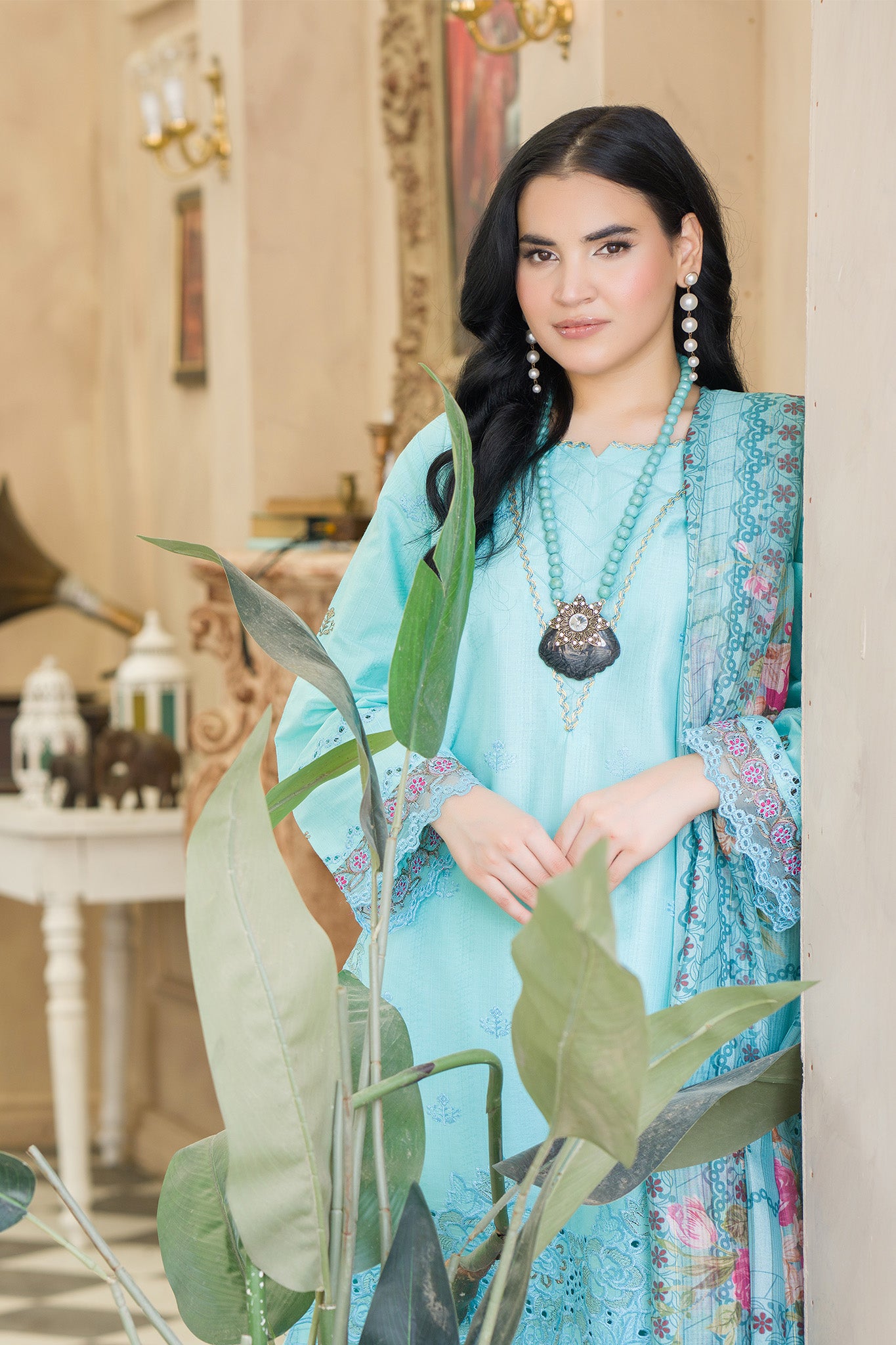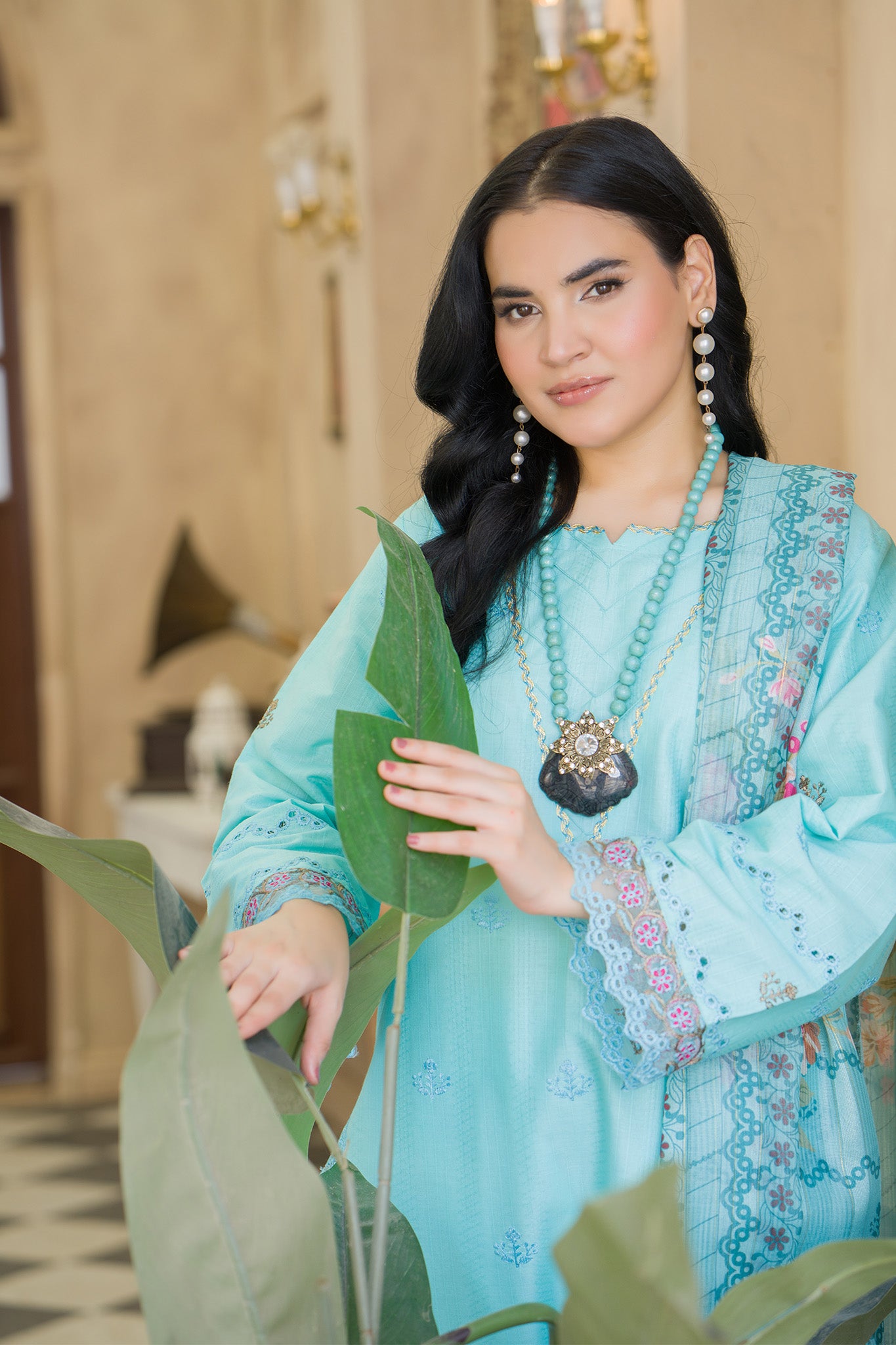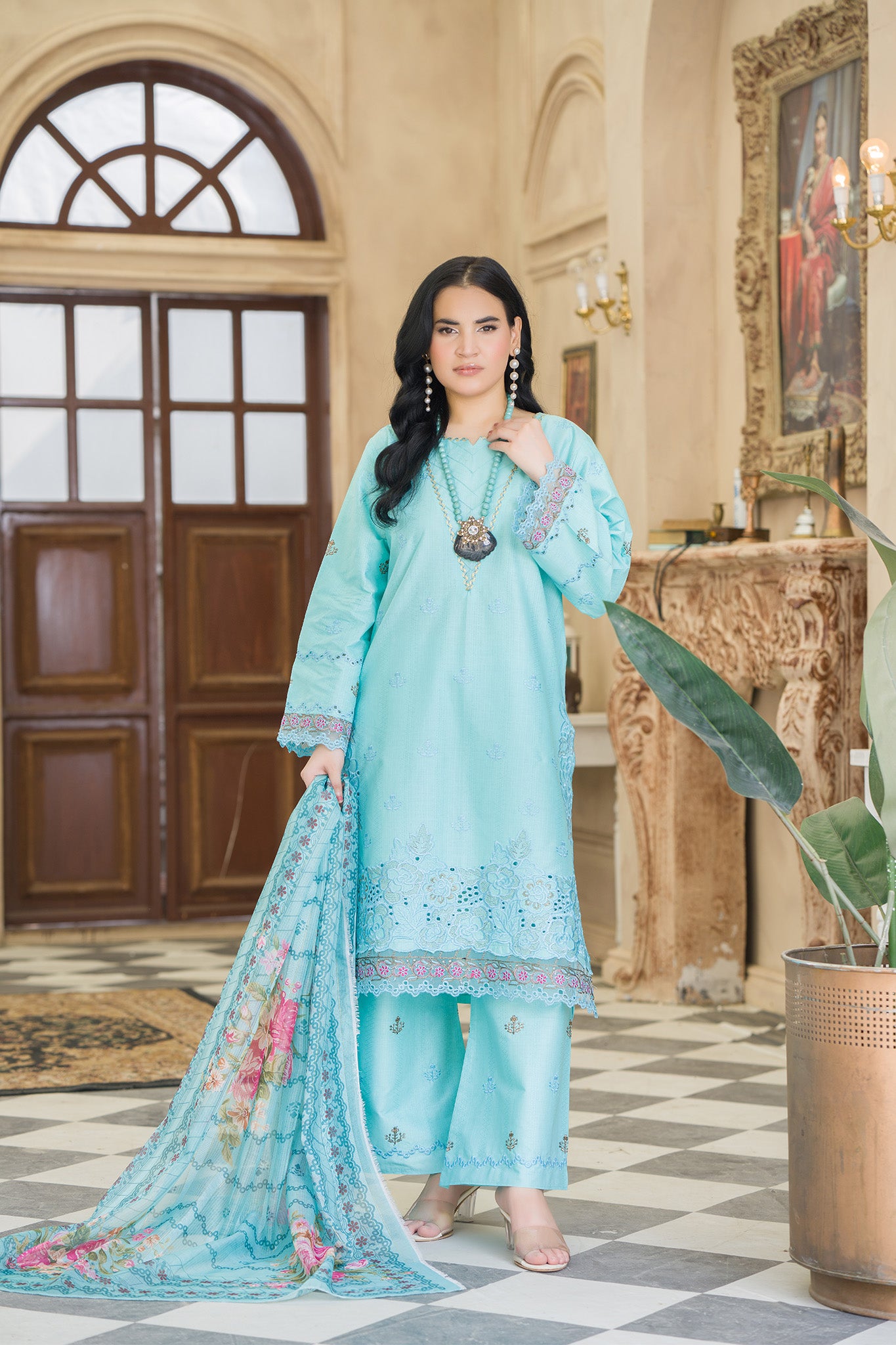 An elegant 3-piece stitched suit crafted from premium lawn, adorned with intricate threadwork embroidery. Paired with a lightweight printed dupatta to enhance its timeless charm. Perfect for festive gatherings or formal occasions.