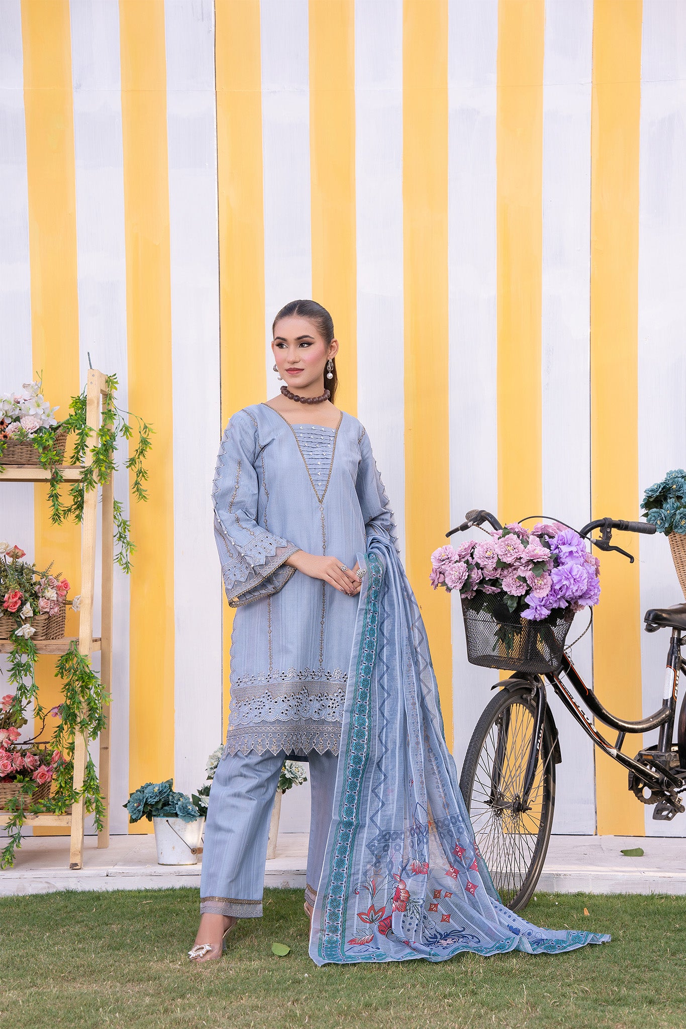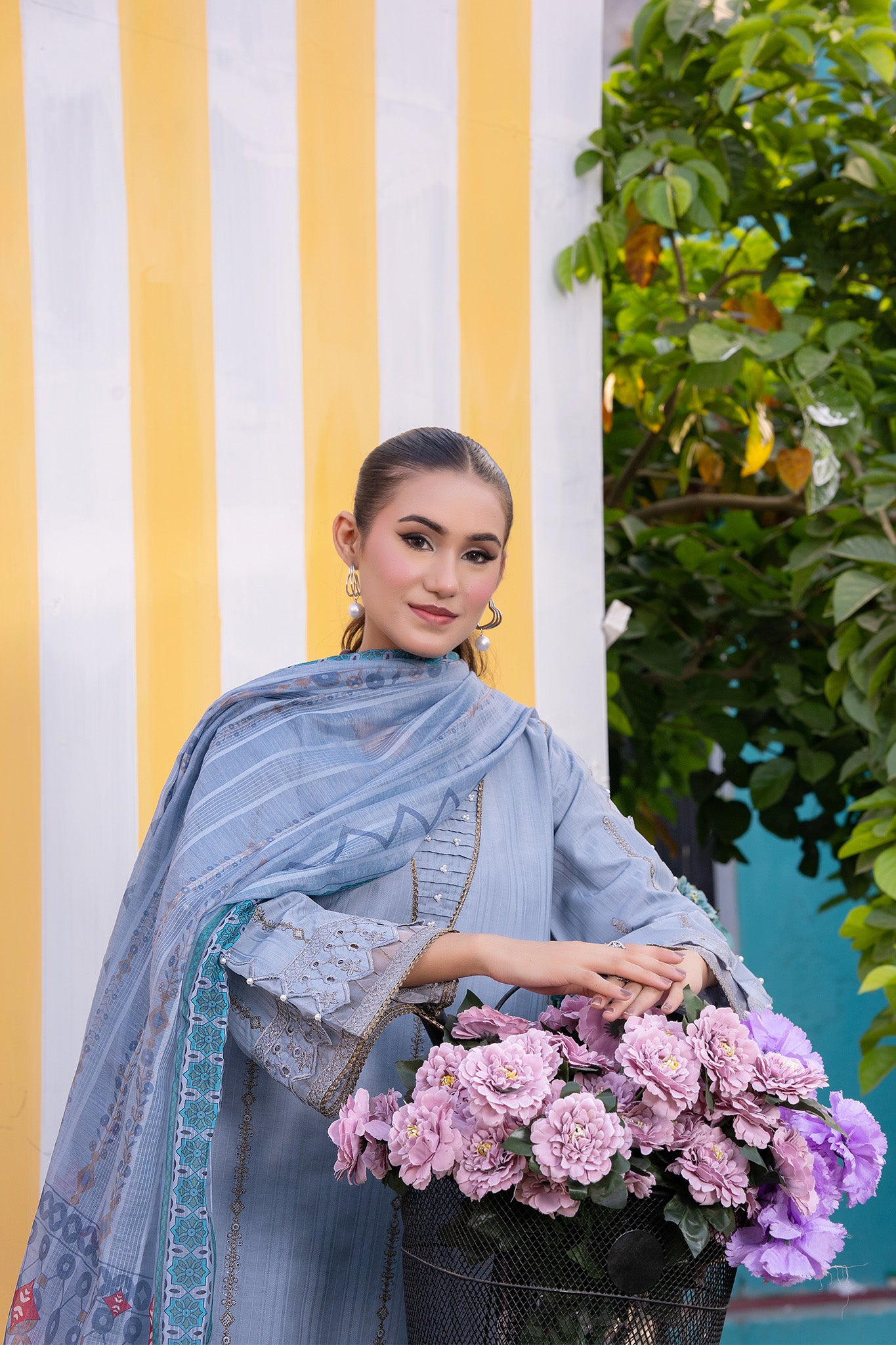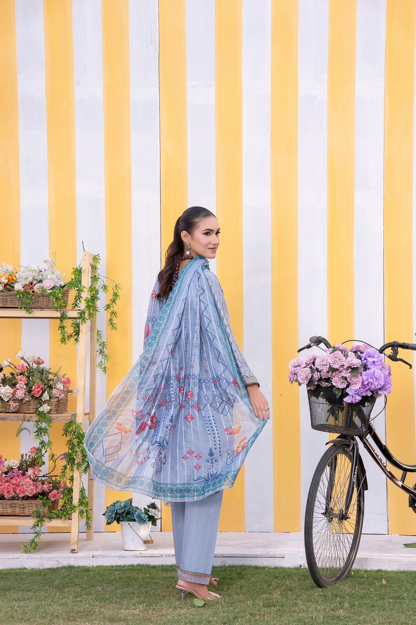 An elegant 3-piece stitched suit crafted from premium lawn, adorned with intricate threadwork embroidery. Paired with a lightweight printed chiffon dupatta to enhance its timeless charm. Perfect for festive gatherings or formal occasions.