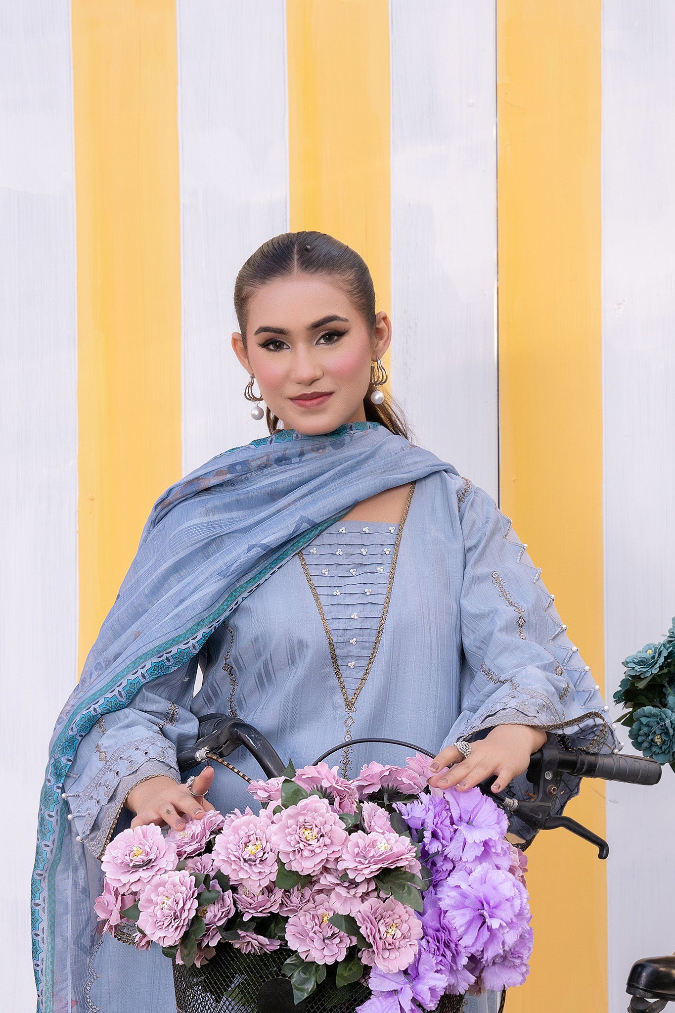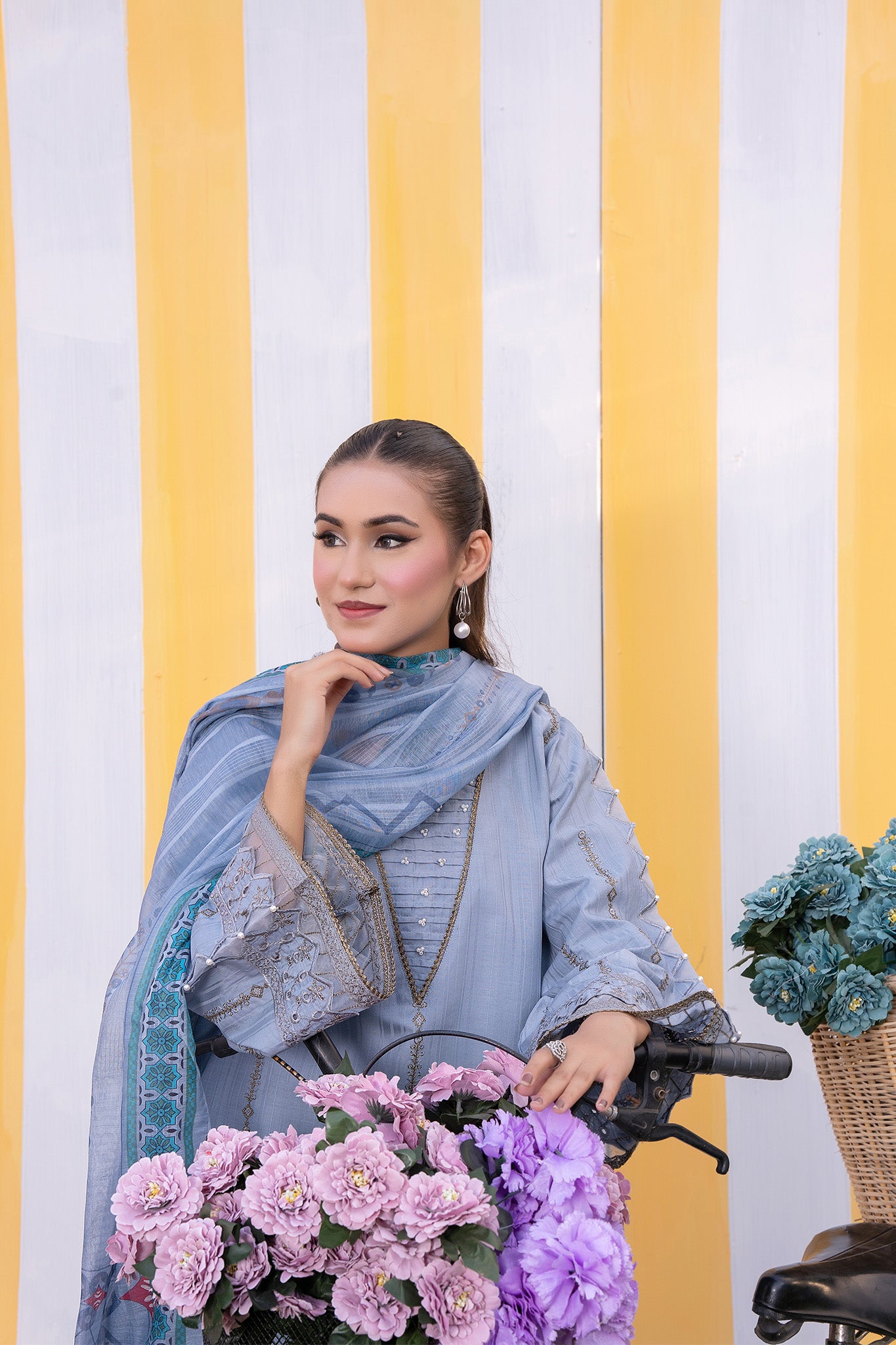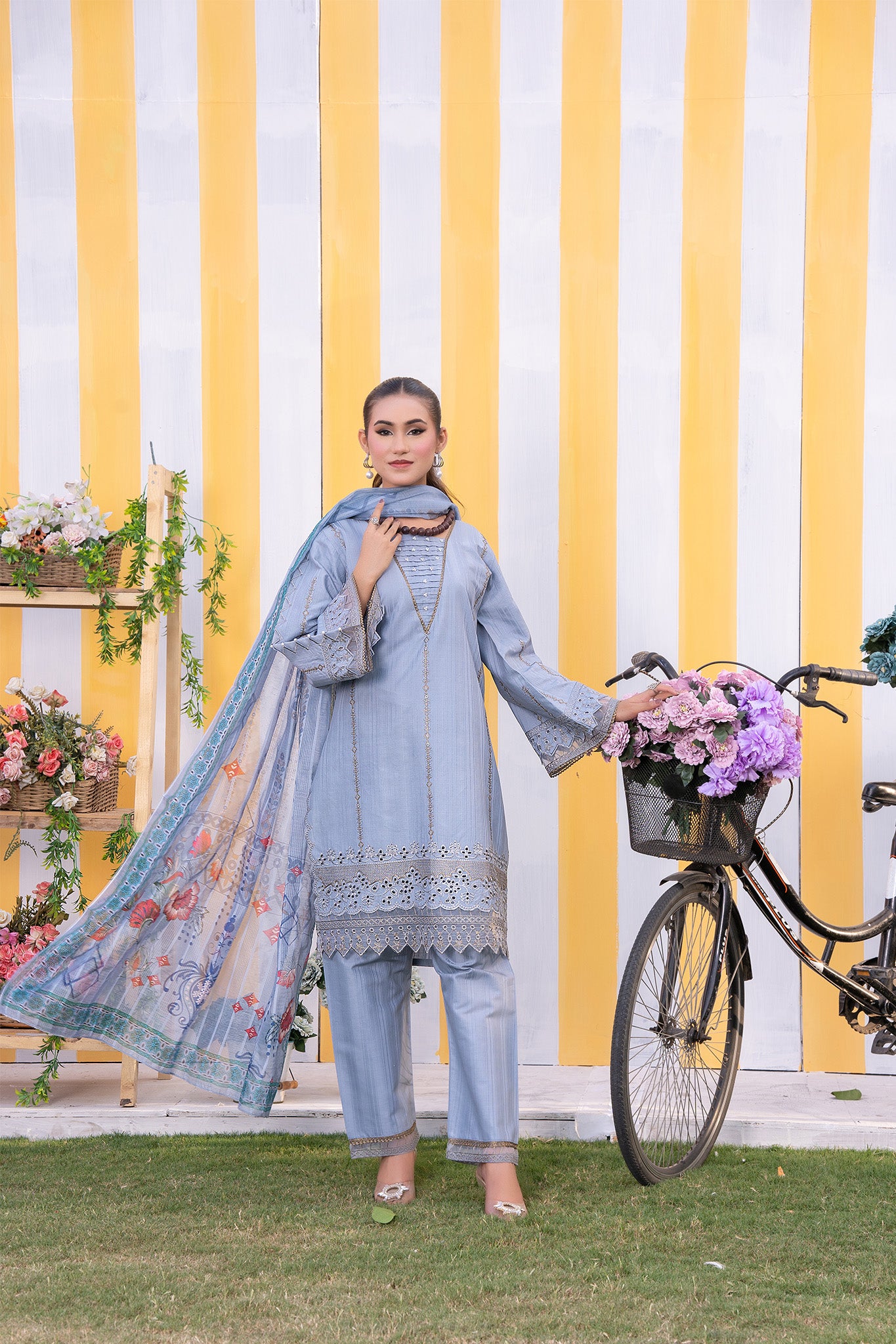 An elegant 3-piece stitched suit crafted from premium lawn, adorned with intricate threadwork embroidery. Paired with a lightweight printed chiffon dupatta to enhance its timeless charm. Perfect for festive gatherings or formal occasions.