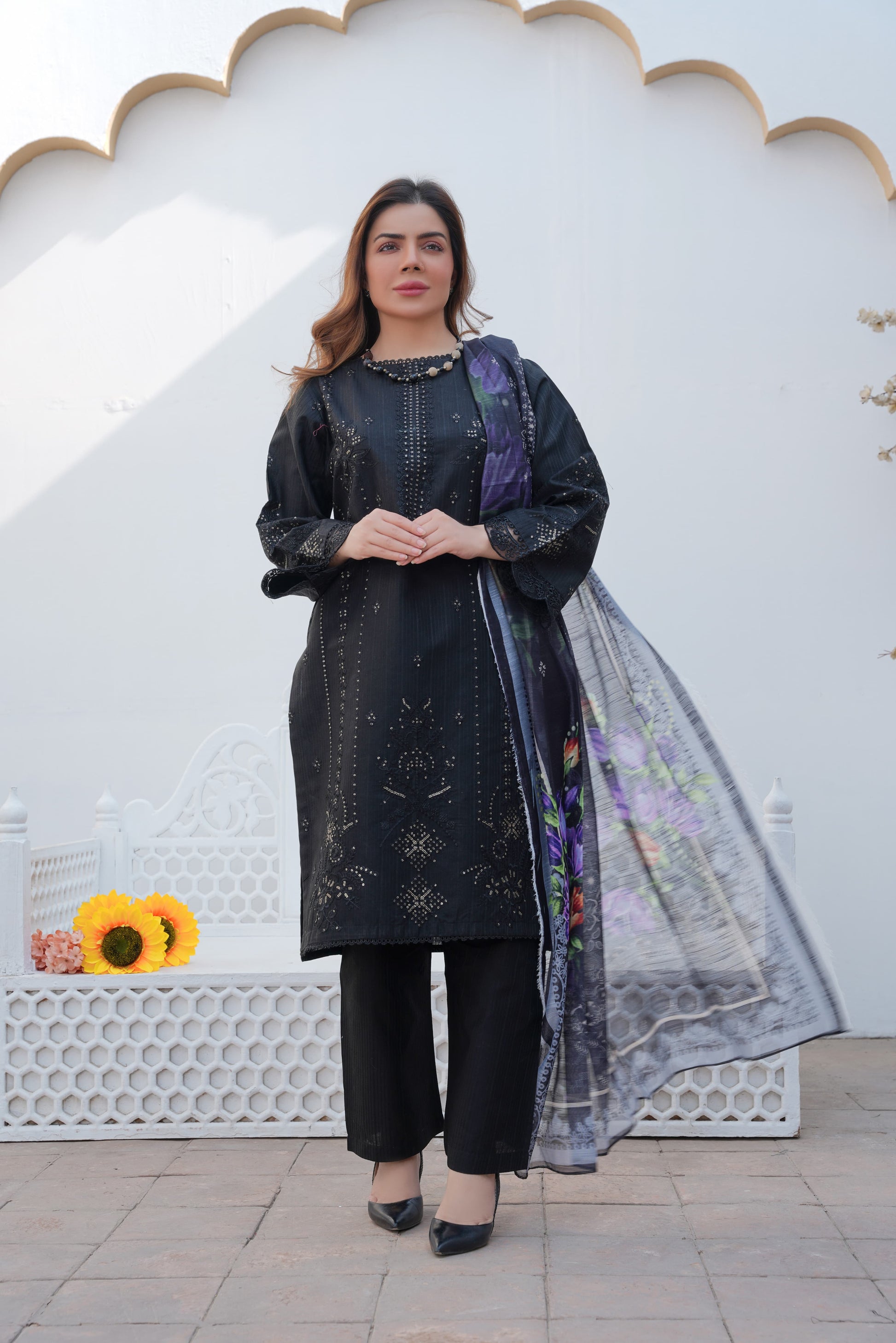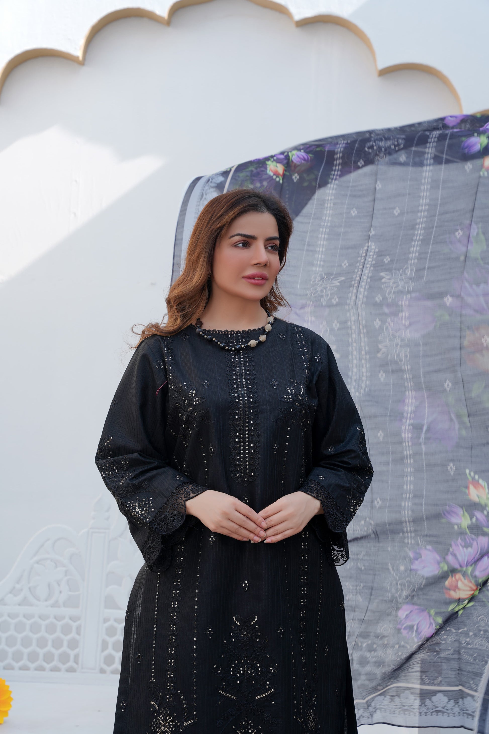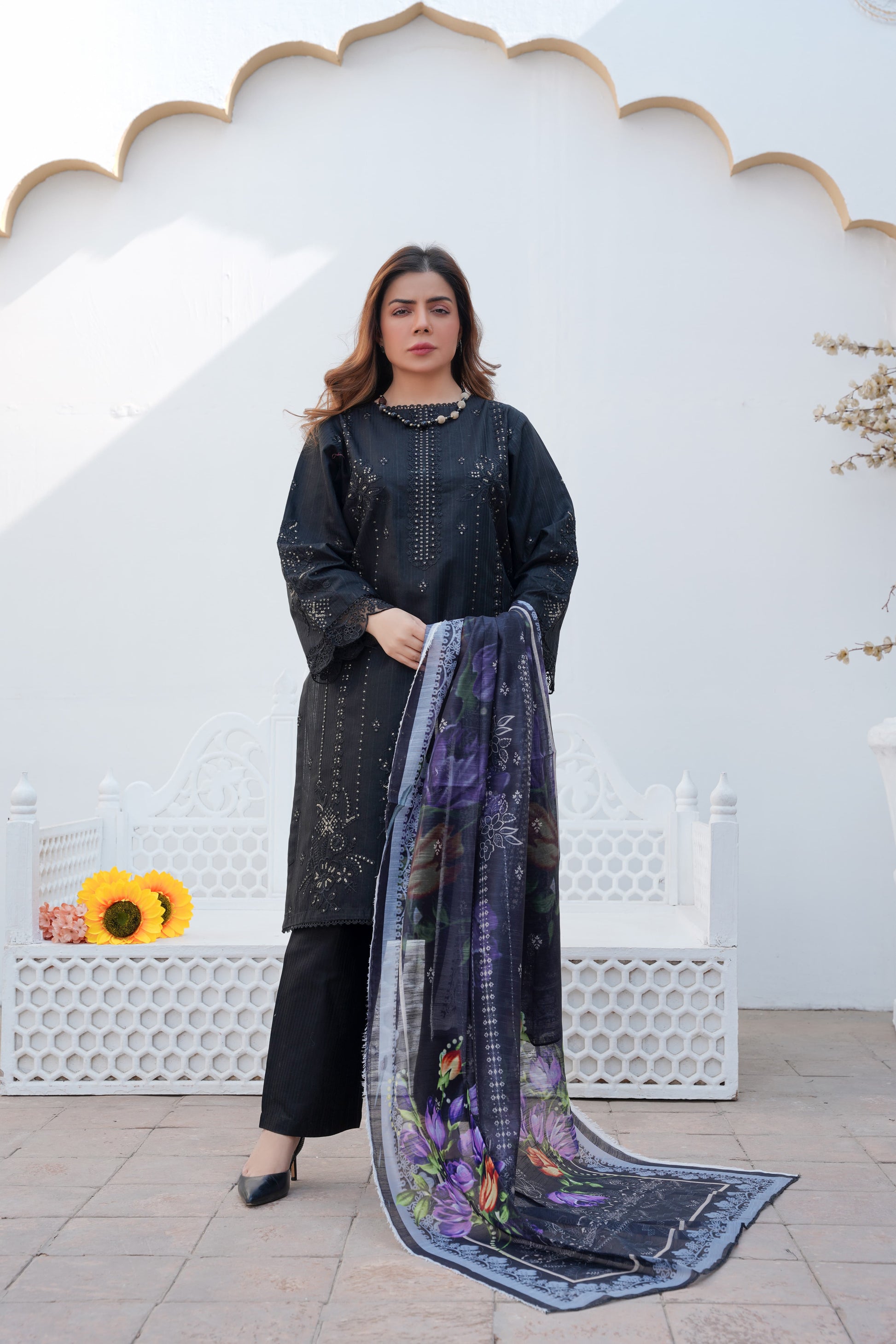 Description: A sophisticated 3-piece suit featuring delicate threadwork embroidery, paired with a flowing shiffon dupatta for a touch of grace and elegance. Ideal for formal events or festive celebrations.