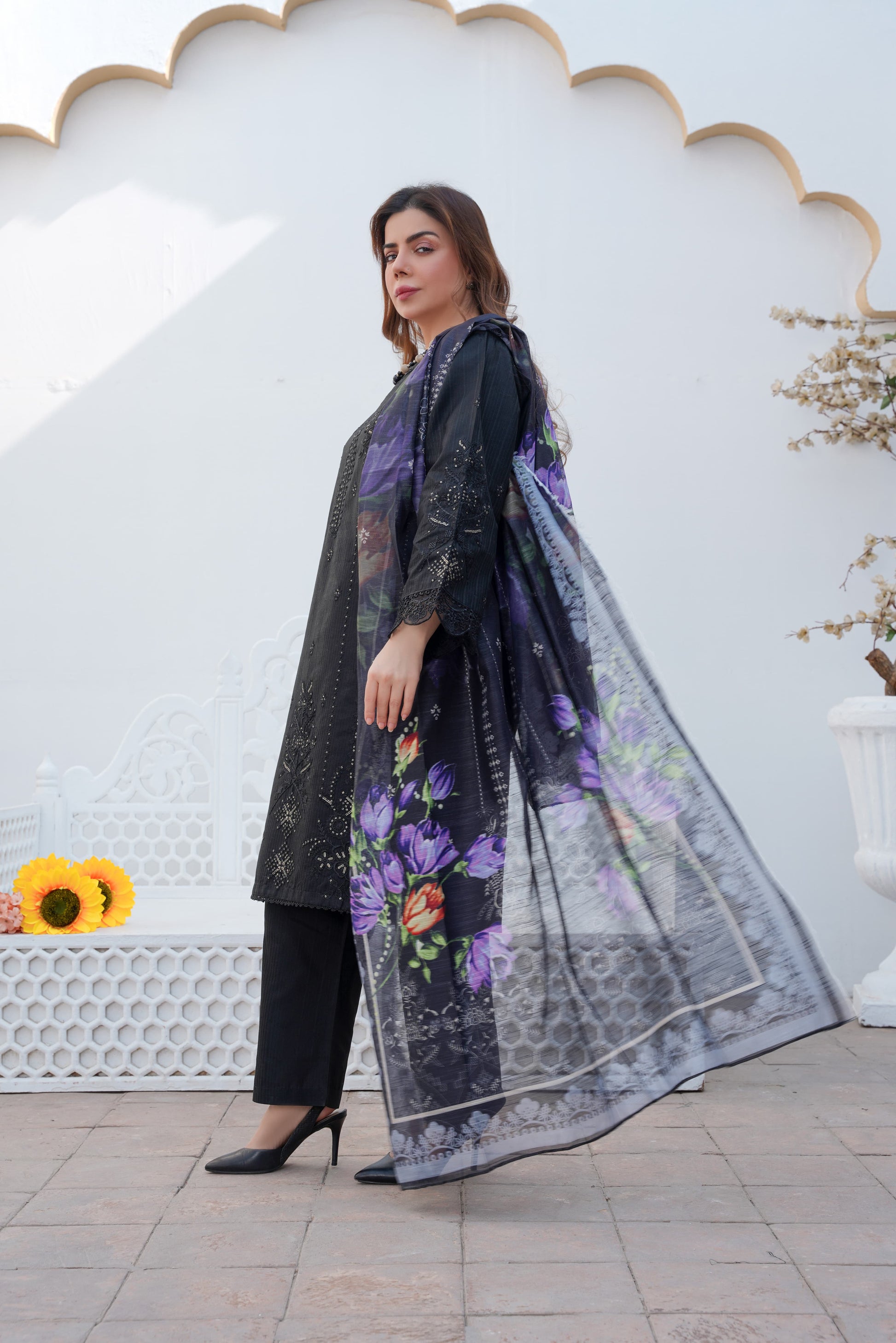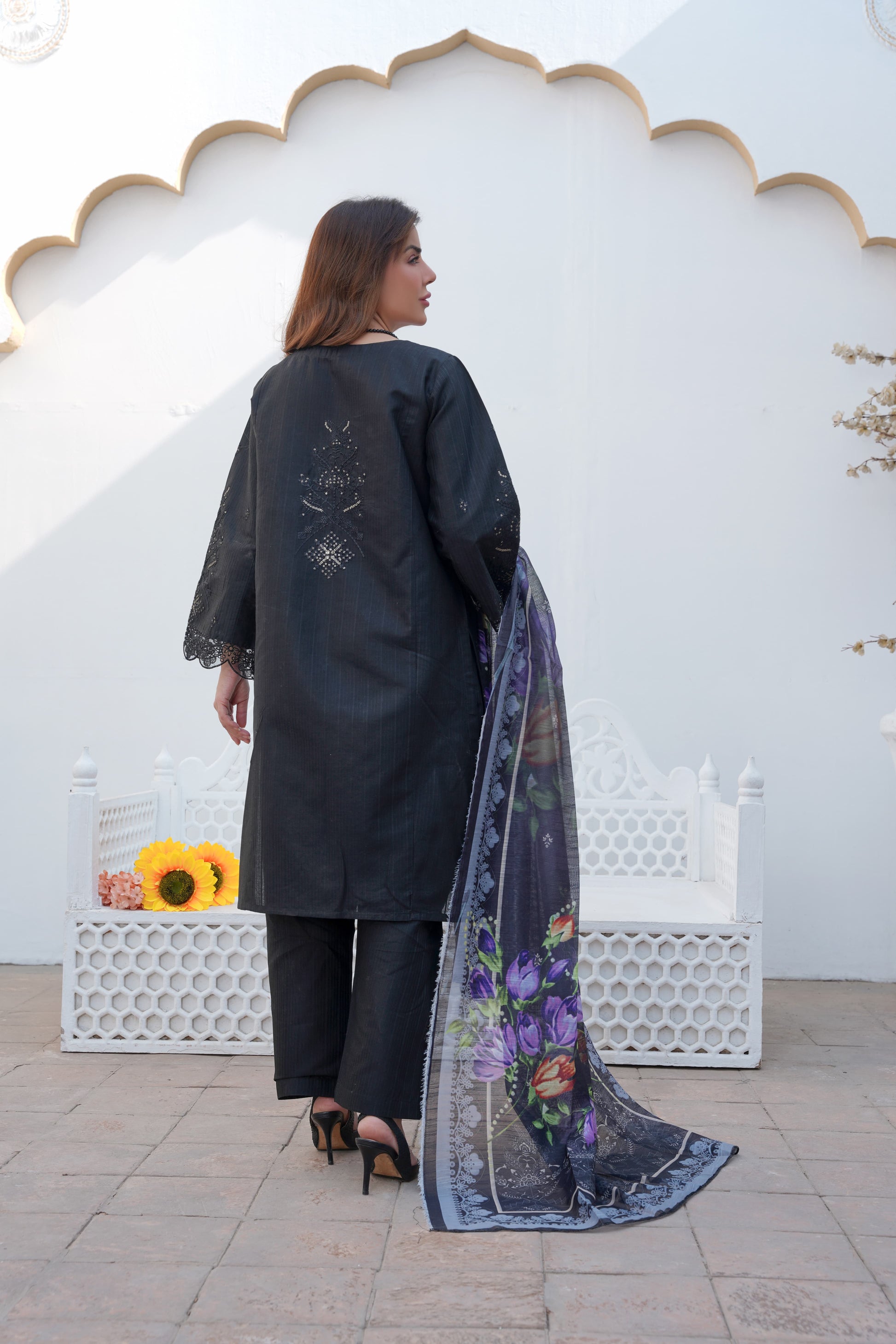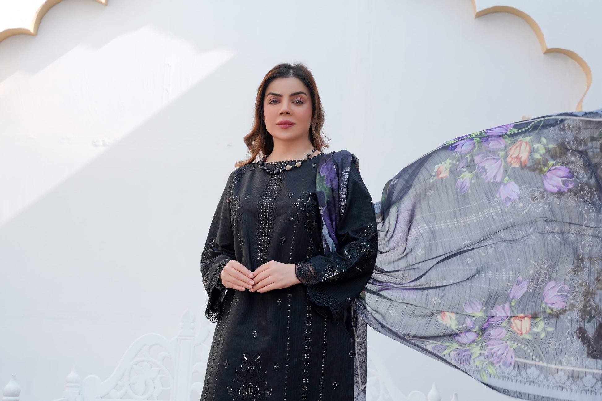 Description: A sophisticated 3-piece suit featuring delicate threadwork embroidery, paired with a flowing shiffon dupatta for a touch of grace and elegance. Ideal for formal events or festive celebrations.